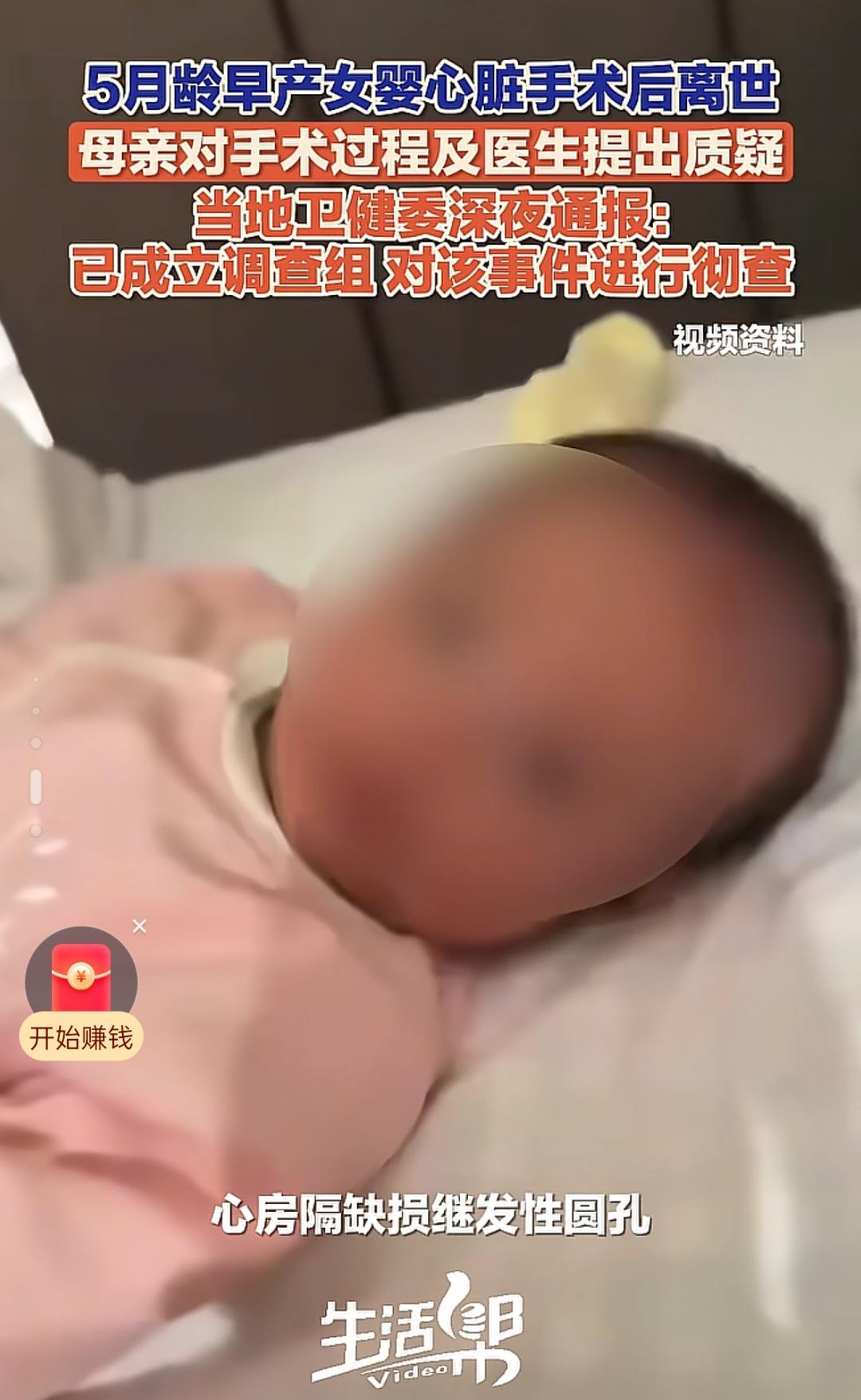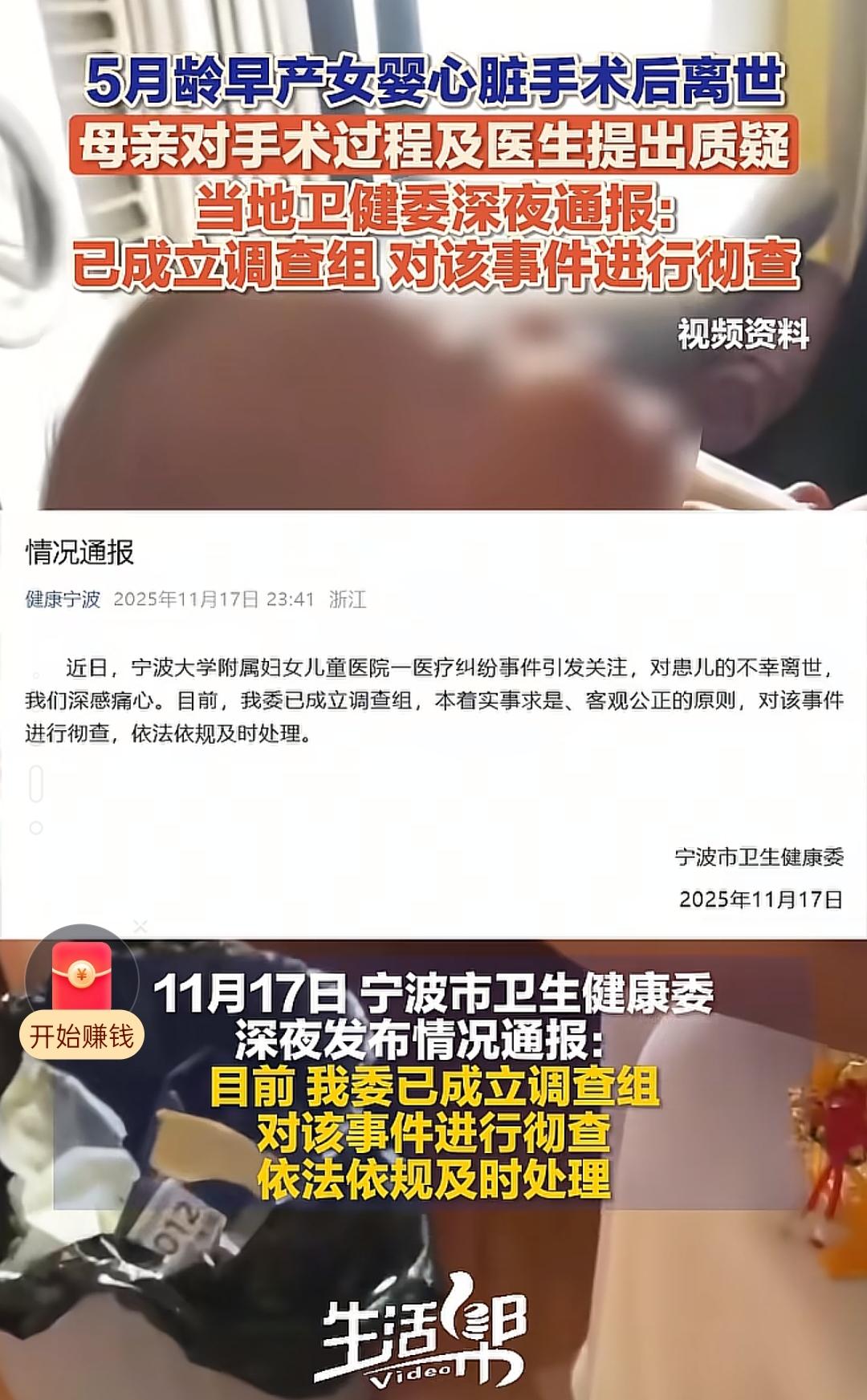 这才是今年让人揪心的事! 宁波妇儿医院婴儿手术争议持续发酵,细节真的让人难以接受! 五个月大的早产女婴有3mm心脏缺损,家长说医生告知需紧急手术, 还称全麻两三个小时就能结束。 可孩子进手术室足足待了9小时, 全麻7小时, 中途新增手术家长未签字知情, 最终宝宝没能保住, 眼角还挂着泪。 据了解, 部分婴儿3mm心脏缺损可能随成长自行闭合, 是否需要紧急手术需结合个体情况评估。 不少网友疑惑, 术前沟通的手术时长、风险与实际情况差距较大, 患者知情权的保障成了大家关注的焦点。 医患信任建立在透明沟通和规范操作上, 家长把稚嫩的孩子交给医院, 盼的是安心救治, 而不是突如其来的变故。 目前卫健委已成立调查组, 涉事医生也已停诊配合调查, 后续结果值得关注。 医疗纠纷的解决需要理性对待, 你觉得术前沟通不充分和医疗规范执行, 哪个是更该重视的问题?