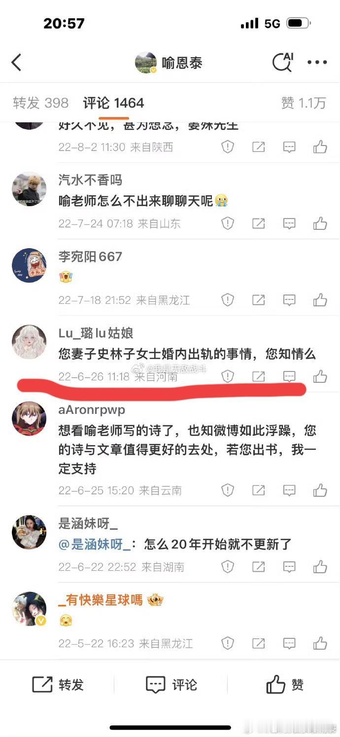 爱看武林外传的朋友可以放心了 秀才喻恩泰没有塌房 因为他不给老婆孩子生活费的事反转了! 喻恩泰夫妇的共同好友发文说喻恩泰史林子3年前分居,因为史林子婚内多次婚内出轨,网上约P,趁喻恩泰外出拍戏时还带男的回家,并且不让喻恩泰见孩子。 还说好几个史林子出轨对象的另一半到喻恩泰微博留言,告诉他史林子背叛婚姻。 可能喻恩泰也是根据留言顺藤摸瓜查到的。 从这个两人共同朋友发的截图来看,史林子对婚姻不忠是前因,喻恩泰不给抚养费是后果。