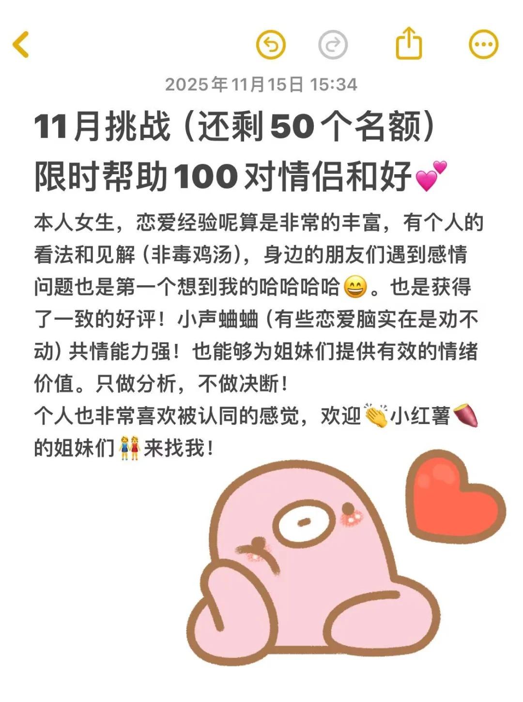 11月挑战帮助100对情侣(无偿分析) 还有50个名额 长期无法无偿