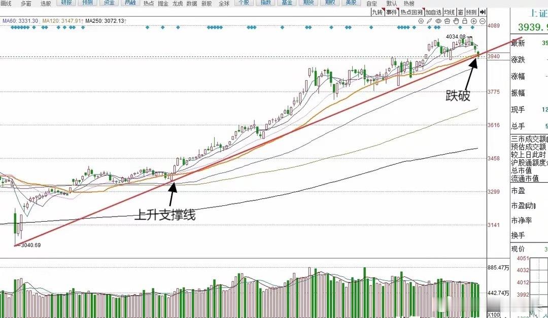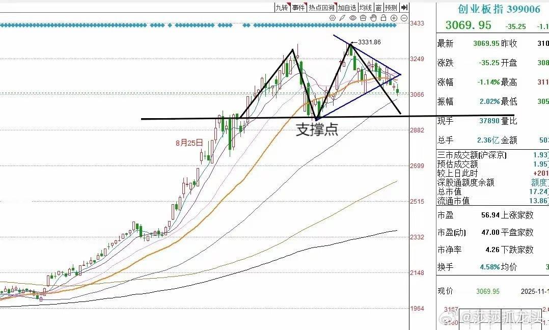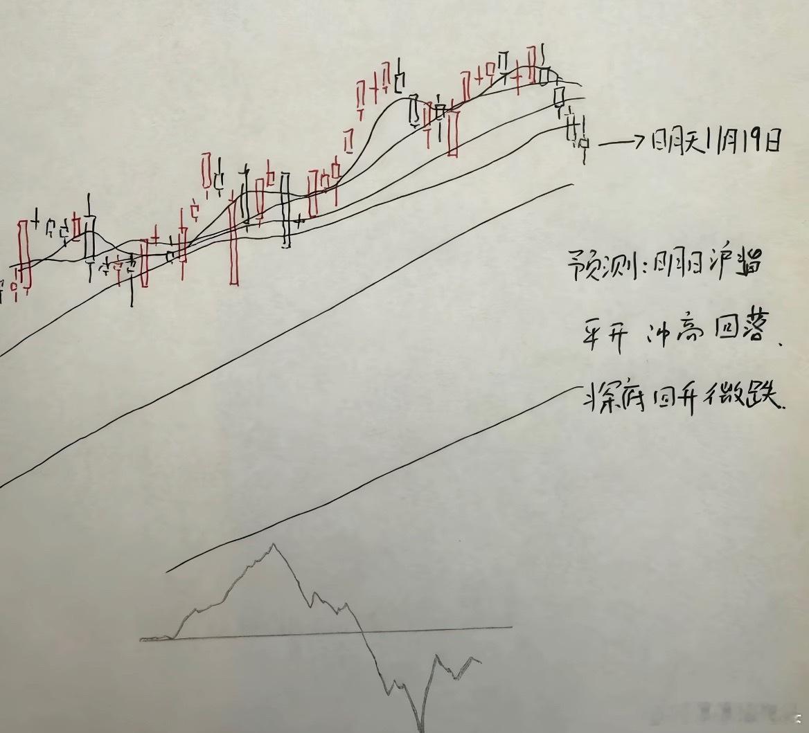 今天A股全线调整连续收下三连阴,明天A股该怎么走?到底是涨还是跌?莎莎做了一个大胆的预判,为什么要这么预判?大家听莎莎给大家讲三个具体理由第一,市场指数今天的最低点3926点,离莎莎上周讲到的市场的强支撑点,3922点,只有4个基点的差距。3922点附近是有强支撑的。所以明天莎莎认为如果外围市场走势不是特别差的情况下,3922点附近可以产生一个上午的反弹。第二,但是由于整体指数,日线级别已经走出三连阴的走势,三连阴的情况下,短线小趋势基本已经成立。并且,明天市场指数如果反弹,就很快就会受到5日均线的压力,以及很快也会受制于低点低点连线的压力。这一条连线是3040点开始的,原始上升支撑线。到今天收盘之后已经被跌破。大家请看图一,上证指数日线图。第三,今天创业板指虽然跌到了60日均线的支撑,但是创业板指上方也全是压力线。创业板指目前已经运行在5日、10日、20日,30日4条均线的下方。并且也运行在了三角形顶点下方。从图二创业板指的强支撑点来看,日线级别前期低点,也就是双头的颈线位置,短线或有强支撑,但是目前还没有到达该点位。还有?根据莎莎观察,外围市场短线近期调整的压力也不小。所以综合以上分析,对于市场走势的判断,莎莎认为明天市场冲高回落,小幅度再调整的可能性相对较大。那么明天A股到底怎么走?大家请看图三关于明天走势的手绘预测图以上观点仅仅代表莎莎个人对于市场的一些粗浅的见解。对于市场走势的分析,莎莎多半从纯粹的技术面出发。对于消息面和基本面的分析则相对较少。所以我的观点不一定正确,仅代表个人见解,不代表任何投资建议。最后莎莎还想补充一点的是,其实最近连续三天的调整早在预判之中,而且在上周开始,莎莎就提出了明确的判断。只是很多朋友一直还沉浸在这一轮大幅上涨的思维惯性之下,殊不知市场已经提前告诉我们很多调整的信号。比如说日线级别已经走出了第5浪的结构,而且在第5浪的时候,出现了明显的量能顶背离,指标顶背离。而且我在上周的时候多次告诉大家,上证指数第5浪的走势已经具备衰竭楔形结构特征。其实。最近连续三天的调整,是完全可以提前预判的。大家点赞,评论➕关注就是对莎莎这个纯技术派的最大支持。
