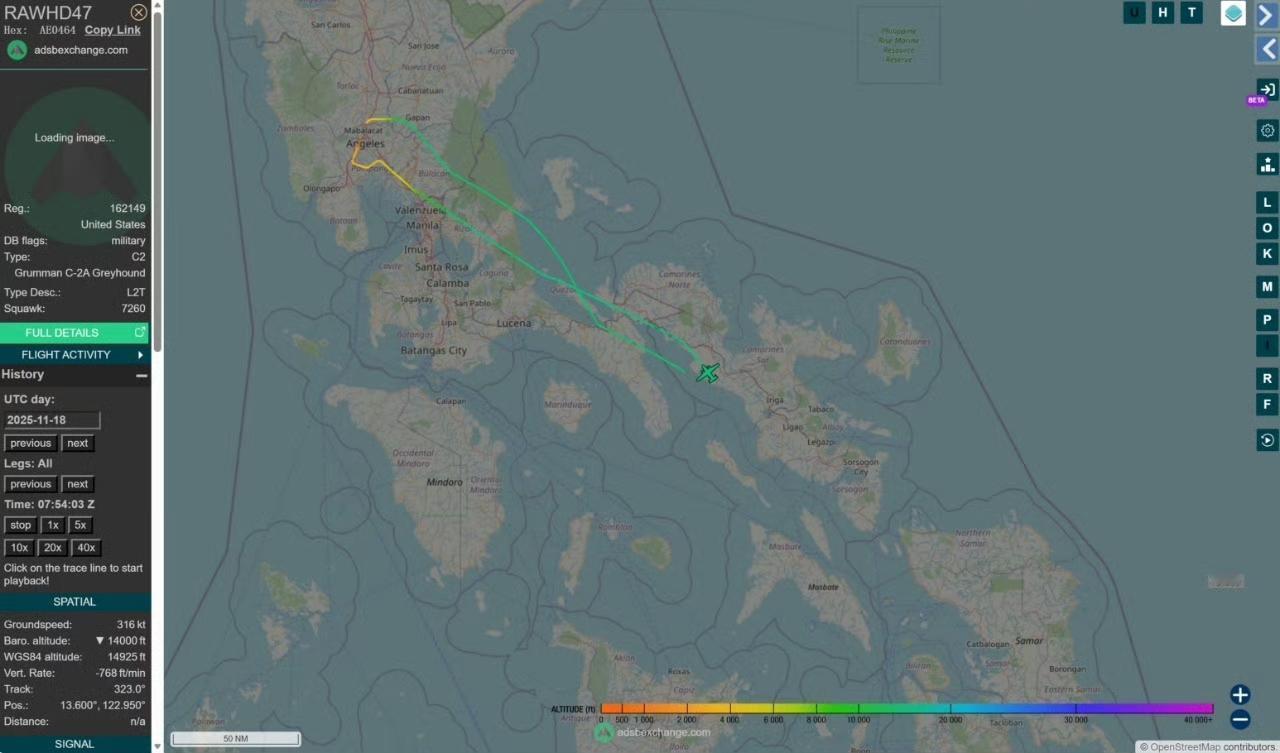 尼米兹号已抵达西太——AIS信号显示,11月18号,美国海军尼米兹号(CVN-68)航母打击群已经通过圣贝纳迪诺海峡进入西太平洋。 比较罕见的是,在尼米兹号抵达西太平洋之后,其舰上的C-2A“灰狗”舰载运输机再次飞往了菲律宾克拉克空军基地。 不会又发生了什么紧急情况吧?