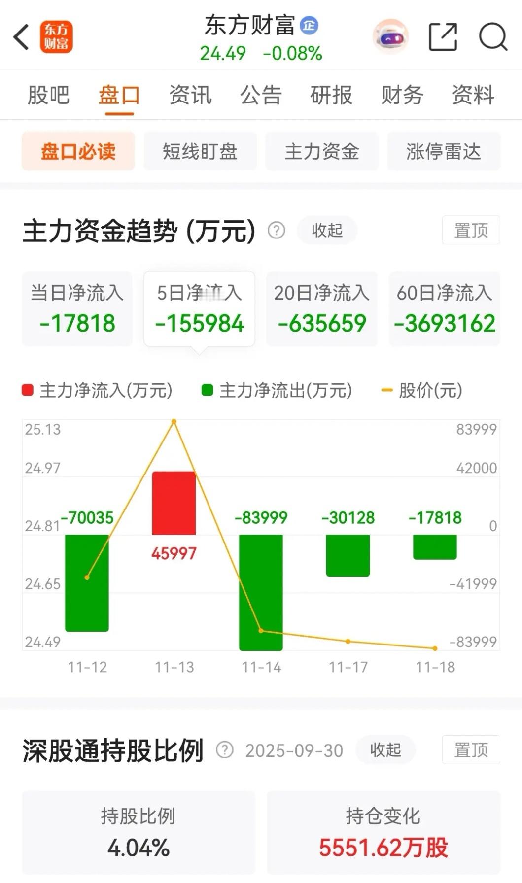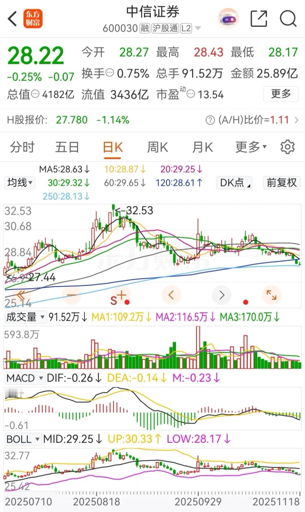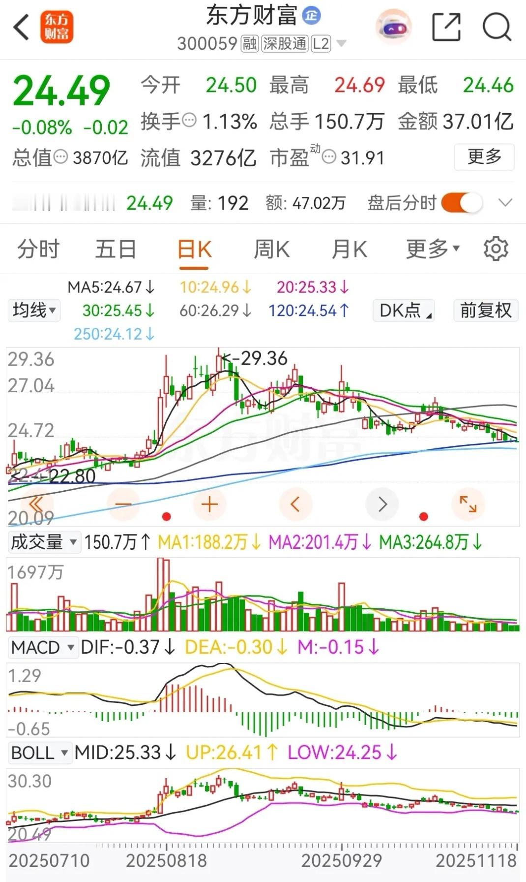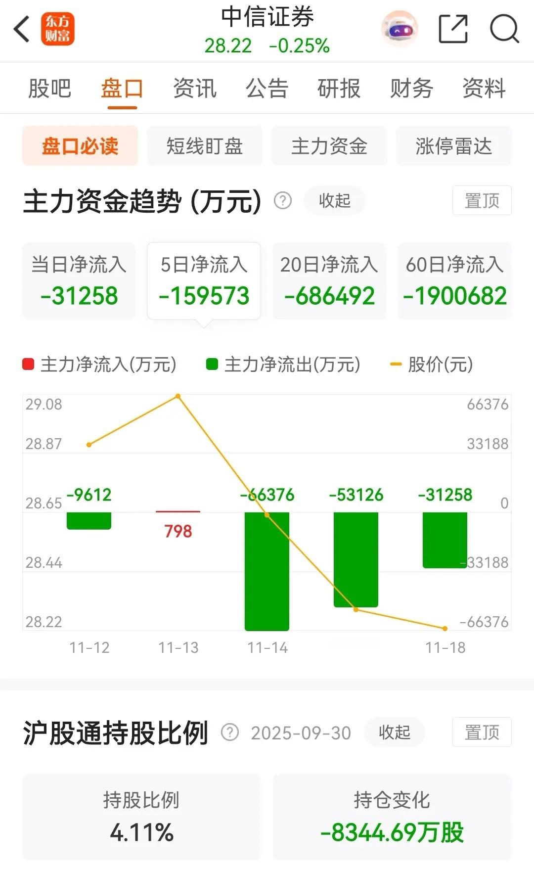 东方财富连续五天横盘整理,今天被主力资金净卖出了1.7818亿元;中信证券则是连续三天下跌,连续三天被主力资金净卖出。东方财富今天低开后震荡整理,连续两天收出缩量十字星线,今天的跌幅为0.08%,收盘报价24.49元,全天的成交金额为 37.01 亿元,换手率为1.13% 。在资金流向上,今天被主力资金净卖出了1.7818亿元,目前已是连续三天被主力净卖出,近五个交易日得合计净卖出金额为 15.5984亿元。从走势上看,股价跌到了半年线处,随之连续五天横盘整理,近两天则是以缩量十字星线报收,变盘信号明显。中信证券则是连续三天下跌,今天低开后震荡整理,最终收出了一颗缩量十字星线,下跌幅度为0.25%,报价为28.22元。在资金流向上,连续三天被主力资金净卖出,今天的净卖额约为3.1258亿元,近五个交易日则是被主力资金合计净卖出了15.9573亿元。从走势上看,中信证券的股价已经跌到了年线上方。下面聊聊政策与估值催化,目前政策调控信号非常明显:监管层通过压制券商权重股(如中信证券尾盘出现10亿级卖单)调节指数节奏,防范急涨急跌。估值修复空间:券商板块PB仅1.52倍,正处于2016年以来40%分位,ROE预期达70%分位,存在“估值-业绩”剪刀差。