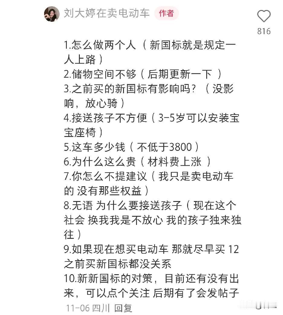 新新国标电动车长这样子,超过25码就断电,爬坡都困难。充电器、雨伞、孩子放哪里?就这样,价格还贵,不低于3800元。 6-14岁的娃安全座椅都坐不下,怎么送娃?还鼓励生二胎、三胎,一人一骑,开多少趟都接不回来。 专家目的很明确,祖国的未来不应该是电动车上的未来,大家要努力让孩子坐上电车而不是电动车,买了电车闲暇时还可以跑跑顺风车,有家庭有未来有收入。 国家良苦用心,大家要理解! 有道理!站着说话不腰疼!