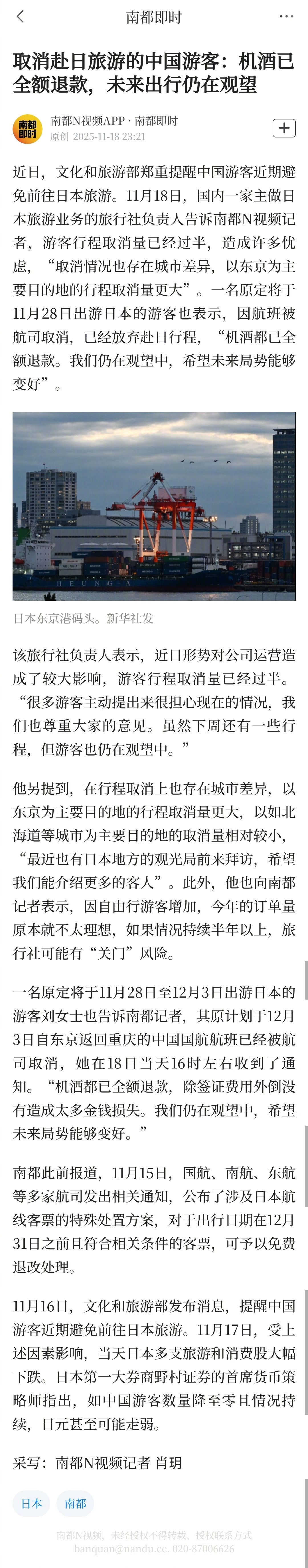 【取消赴日旅游的中国游客:机酒已全额退款,未来出行仍在观望】近日,文化和旅游部郑重提醒中国游客近期避免前往日本旅游。11月18日,国内一家主做日本旅游业务的旅行社负责人告诉南都N视频记者,游客行程取消量已经过半,造成许多忧虑,“取消情况也存在城市差异,以东京为主要目的地的行程取消量更大”。一名原定将于11月28日出游日本的游客也表示,因航班被航司取消,已经放弃赴日行程,“机酒都已全额退款。我们仍在观望中,希望未来局势能够变好”。该旅行社负责人表示,近日形势对公司运营造成了较大影响,游客行程取消量已经过半。“很多游客主动提出来很担心现在的情况,我们也尊重大家的意见。虽然下周还有一些行程,但游客也仍在观望中。”他另提到,在行程取消上也存在城市差异,以东京为主要目的地的行程取消量更大,以如北海道等城市为主要目的地的取消量相对较小,“最近也有日本地方的观光局前来拜访,希望我们能介绍更多的客人”。此外,他也向南都记者表示,因自由行游客增加,今年的订单量原本就不太理想,如果情况持续半年以上,旅行社可能有“关门”风险。一名原定将于11月28日至12月3日出游日本的游客刘女士也告诉南都记者,其原计划于12月3日自东京返回重庆的中国国航航班已经被航司取消,她在18日当天16时左右收到了通知。“机酒都已全额退款,除签证费用外倒没有造成太多金钱损失。我们仍在观望中,希望未来局势能够变好。”
