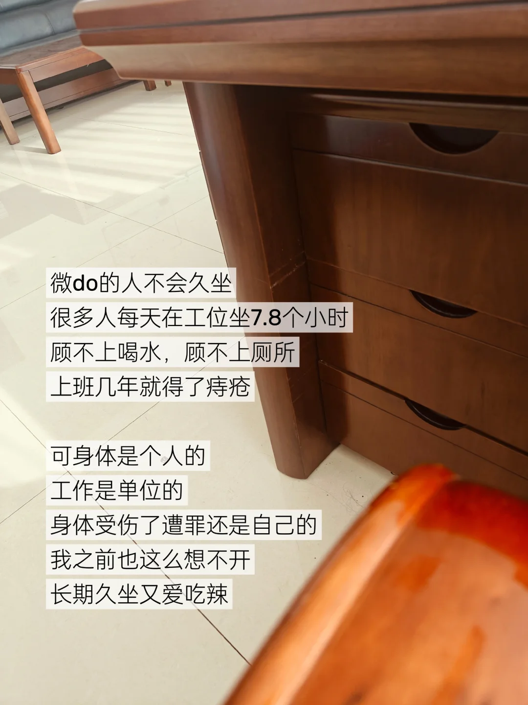 很多职场新人每天坐78小时,顾不上喝水上厕所,久而久之就会便m,甚至得了痔疮。身体是个人的,工作是单位的,身体遭罪受苦的还是自己。