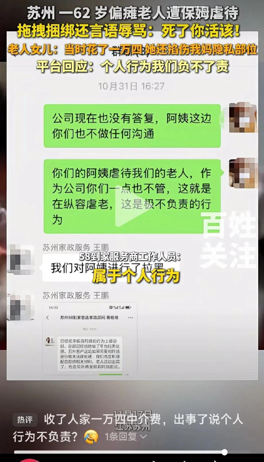 苏州一62 岁偏瘫老人遭保姆虐待,拖拽捆绑还言语辱骂:死了你活该!保姆固然可恶,但平台更恶心。中介费1万4就换回平台一句“个人行为”,收了钱却不担责,这甩锅行为比保姆可恶更让人寒心! 找正规平台,不就是想图个保证。结果出了事情,平台却拉黑保姆并声称虐待是个人行为,并拒绝承担责任。原来拉黑是处罚,不要太搞笑了。 保姆应当受到法律严惩,但平台也应该有不可推卸的责任! 虐待行为对失能老人造成不可逆身心创伤,部分案例中老人因长期恐惧加速病情恶化。所以我们选择家政服务时,务必查验平台资质、留存合同,并优先选用有实时监控反馈的机构,避免此类事件的再次发生!