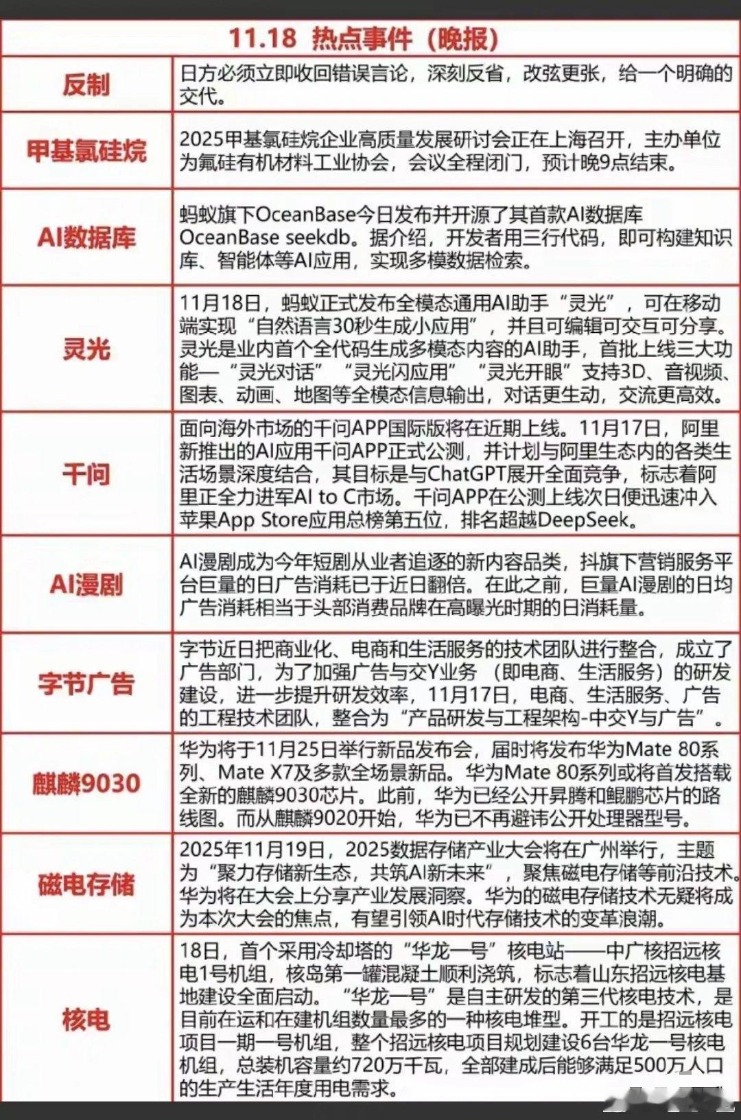 11.18财经热点梳理分析(晚报)这十大板块覆盖了外交回应、产业会议、AI技术、企业动态、芯片、存储、核电等热点领域,各板块对应的个股梳理如下:反制该板块是针对日方错误言论的回应,关联国防军工赛道。1. 中船防务:海军装备核心供应商,主营船舶及海洋工程装备,军工船舶领域技术积淀深厚,国防需求支撑业务稳定性较强。2. 中航沈飞:国内战斗机整机制造龙头,承担多款主力机型生产,国防订单充足,业绩增长确定性较高。3. 航天彩虹:无人机及复合材料领域核心企业,军用无人机需求旺盛,同时布局民用市场,业务呈多元化拓展。甲基氯硅烷该板块对应氟硅材料产业会议,关联有机硅产业链。1. 三友化工:拥有有机硅产能,甲基氯硅烷是其核心原料,受益于行业供需格局优化,有机硅业务产能居国内前列。2. 合盛硅业:全球硅基新材料龙头,甲基氯硅烷产能领先,有机硅营收占比高,成本控制能力强,行业地位稳固。3. 兴发集团:布局氟硅产业链,甲基氯硅烷产能配套完善,依托磷硅协同优势,在氟硅材料领域竞争力较强。AI数据库该板块是蚂蚁发布开源AI数据库,关联数据库及算力支撑赛道。1. 中科曙光:布局数据库与AI算力基建,与数据库企业合作紧密,算力硬件可支撑AI数据库落地,业务协同性较强。2. 神州数码:代理数据库产品并布局自主研发,AI数据库的推广有望带动其相关业务规模增长。3. 海量数据:专注数据库领域,提供管理与服务,AI数据库发展拓展其应用场景,行业需求提升利好业绩。灵光该板块是蚂蚁发布全模态AI助手,关联AI交互技术赛道。1. 科大讯飞:AI语音及助手领域龙头,技术积累深厚,覆盖多模态交互,契合全模态AI助手的发展趋势。2. 拓尔思:自然语言处理技术领先,为AI助手提供语义理解支持,AI助手普及将带动其NLP技术商业化落地。3. 汉王科技:布局多模态交互技术,在AI助手的人机交互、内容生成方面有储备,受益于产品推广。千问该板块是阿里AI应用公测,关联阿里生态赛道。1. 浙大网新:与阿里在AI领域有合作,参与阿里生态项目,千问的生态结合有望带动其业务协同增长。2. 三江购物icon:阿里系参股企业,属于阿里生态生活场景,千问与场景结合或带来业务联动机会。3. 君正集团:参股蚂蚁集团,蚂蚁与阿里在AI领域协同,千问发展间接利好其投资收益预期。AI漫剧该板块是抖音AI漫剧热度提升,关联IP与内容赛道。1. 中文在线:拥有海量IP资源,AI漫剧带动其IP动漫化开发,与短视频平台合作紧密,变现渠道进一步拓宽。2. 掌阅科技icon:数字阅读内容储备丰富,AI漫剧可依托其文学IP创作,业务拓展至AI内容生产领域。3. 捷成股份:手握影视版权资源,AI漫剧创作需版权支持,公司资源可对接创作需求,合作空间较大。字节广告该板块是字节整合广告与电商团队,关联广告代理赛道。1. 省广集团:字节广告代理核心伙伴,字节广告整合后投放效率提升,将带动其代理业务规模增长。2. 蓝色光标icon:与字节在营销领域深度合作,字节广告与电商整合后需求增加,受益于广告投放量提升。3. 天龙集团:字节系广告服务商,专注互联网营销,字节广告业务扩张将带动其代理收入增长。麒麟9030 该板块是华为icon将发布新芯片,关联芯片产业链赛道。1. 中芯国际:华为芯片供应链相关企业,芯片国产替代背景下,受益于国内芯片制造需求提升。2. 长电科技:芯片封装测试龙头,麒麟芯片量产需其封装服务,业务需求随芯片发布增加。3. 沪硅产业:半导体硅片核心供应商,麒麟芯片生产需硅片材料,公司技术支撑芯片产业链发展。磁电存储该板块是华为将分享磁电存储技术,关联存储赛道。1. 兆易创新:存储芯片设计龙头,磁电存储属存储前沿技术,公司布局有望对接相关应用。2. 北京君正:存储及处理器芯片企业,磁电存储发展将带动存储芯片需求,受益于行业升级。3. 江波龙:存储产品解决方案商,磁电存储推广拓展应用场景,有望参与相关供应链。核电该板块是华龙一号核电站开工,关联核电产业链赛道。1. 中国广核:招远核电项目主体,国内核电运营龙头,项目建设将提升其装机容量,支撑业绩增长。2. 中国核建:核电工程建设龙头,承担华龙一号建设任务,项目开工带动其工程订单增加。3. 沃尔核材:核电材料供应商,提供绝缘材料等产品,项目建设拉动其核电材料需求。总结这十大板块涵盖了外交回应、产业升级、AI技术落地、企业业务整合、芯片与存储创新、核电建设等当前核心热点方向,既体现了科技自主的推进,也反映了互联网企业在AI领域的密集布局,以及传统产业的扩张节奏。本文涉及资讯、数据等内容来自网络公共信息,仅供参考,不构成投资建议!