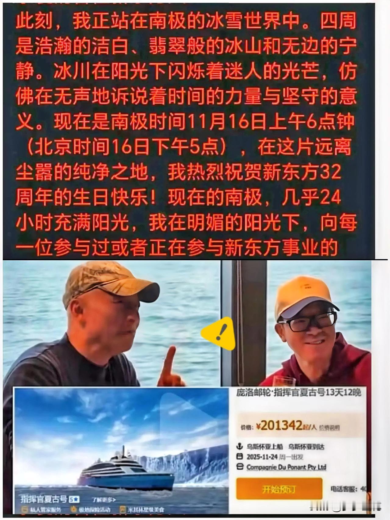 老俞的信提醒我们 有钱可以享受 但是不能在员工辛苦打拼时过度炫耀。 如果老俞只是独自去南极旅游,确实引起了员工的不满。 毕竟在大家连夜加班做续课方案、处理家长投诉,甚至上完10小时课仍要赶工的节点,老板却开启最高房型148万元/人、最低房型26万元/人的南极之旅(行程约29天)。 难免让员工觉得自己的付出没被重视,再加上社保按最低基数缴纳、节假日三倍课时费缺失等长期存在的问题,这种反差感更放大了不满情绪。 可要是老俞能把这份“享受”转化为对员工的实际关怀,比如补上缺失的福利、增加团建补贴,或是在忙碌期后给员工放带薪假期,那意义就完全不同了。 员工会感受到老板对付出的认可,工作积极性肯定会大幅提升。 而且这些实际关怀,还能增进员工对企业的归属感,让团队更有凝聚力。 大家感受到被重视、被善待,后续工作配合也会更默契。 网友热评:只看到他成功后的甜,有谁看到过他创业时的苦?只要薪资合理、不欠薪、一般福利到位,老板出去散散心没啥大惊小怪的。个人观点,不喜勿喷。声明我也是打工人。 友友们你们怎么看?欢迎评论区留言讨论