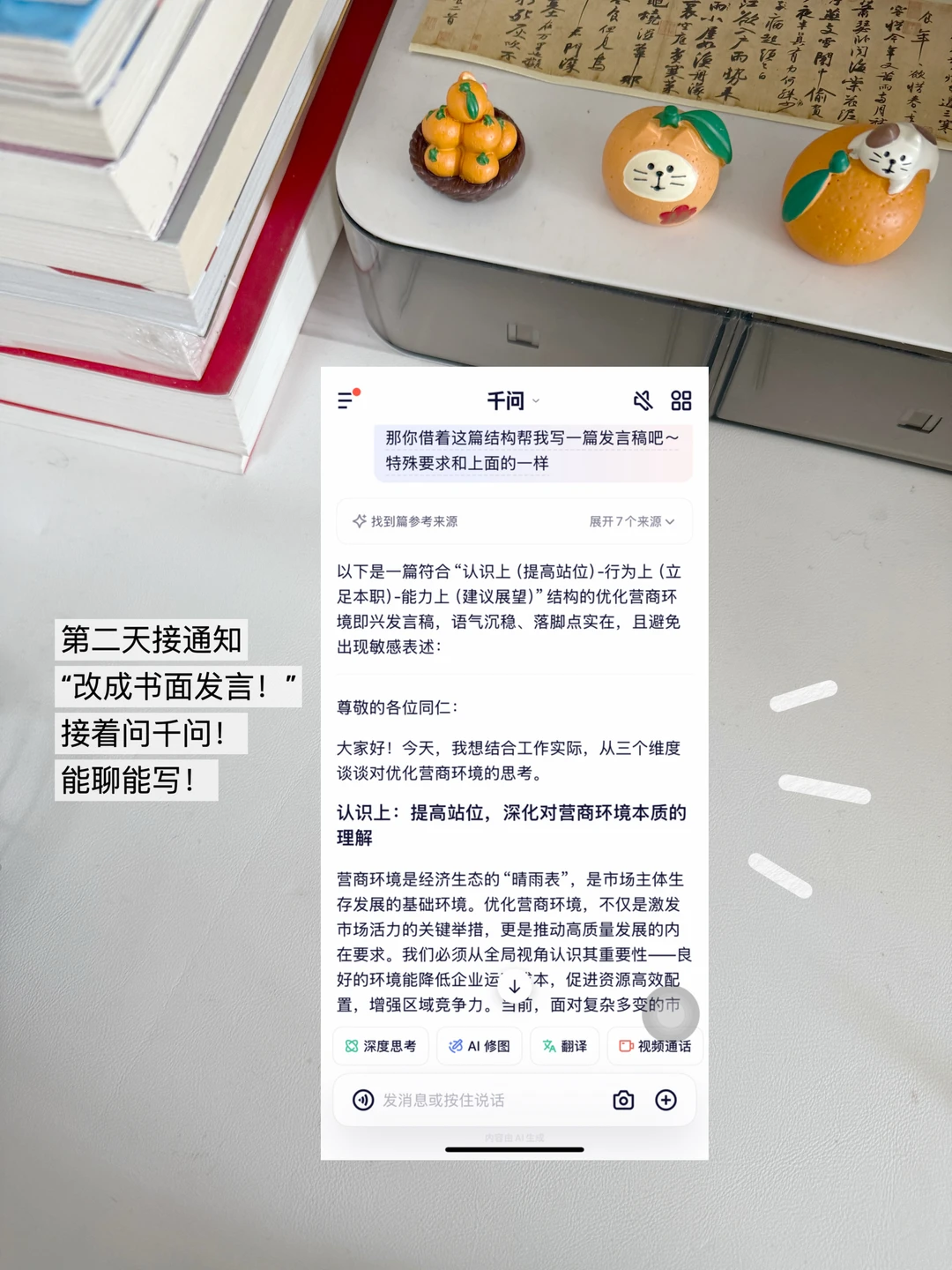 当然也能继续追问,让千问直接写一篇发言稿参考,它能能很好地理解写作语境,用词也精准。单位写作的日常需求就也可以让千问协助了。