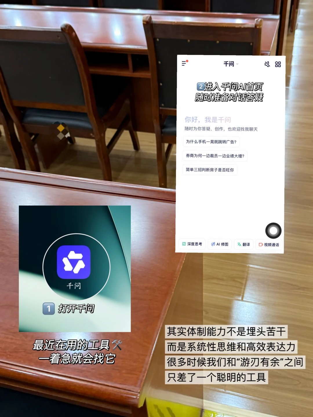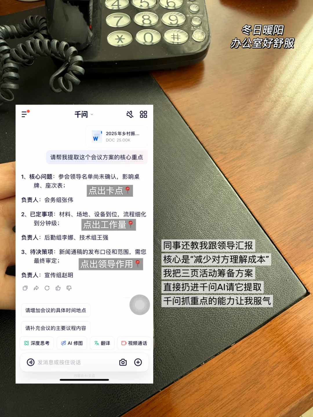 很多人用AI准备材料都是长篇大论无重点。她教我,跟领导汇报,核心是“减少对方理解成本”。一次,我用三页方案汇报活动筹备情况,她教我用三句话说清。看我为难,便让我试试千问AI