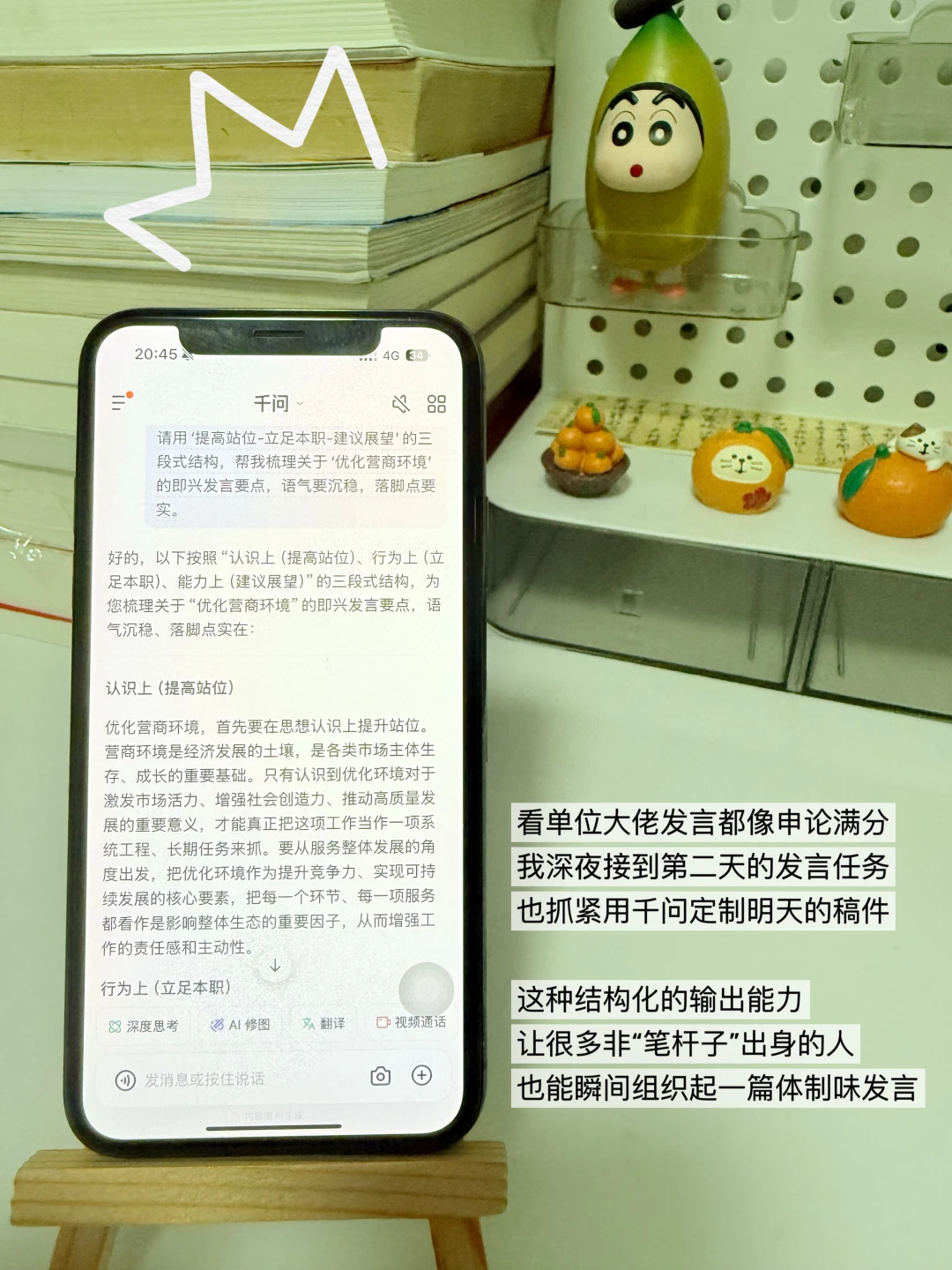 看单位大佬发言都像申论满分,现在我也会用千问热身。比如预感会被问到对某问题看法,就输入指令如图六,千问给出的结构清晰安心:认识上、行动上、建议上。这种结构化的输出能力,让很多非笔杆子出身的人,也能瞬间组织起一篇有水平、带体制味的发言。