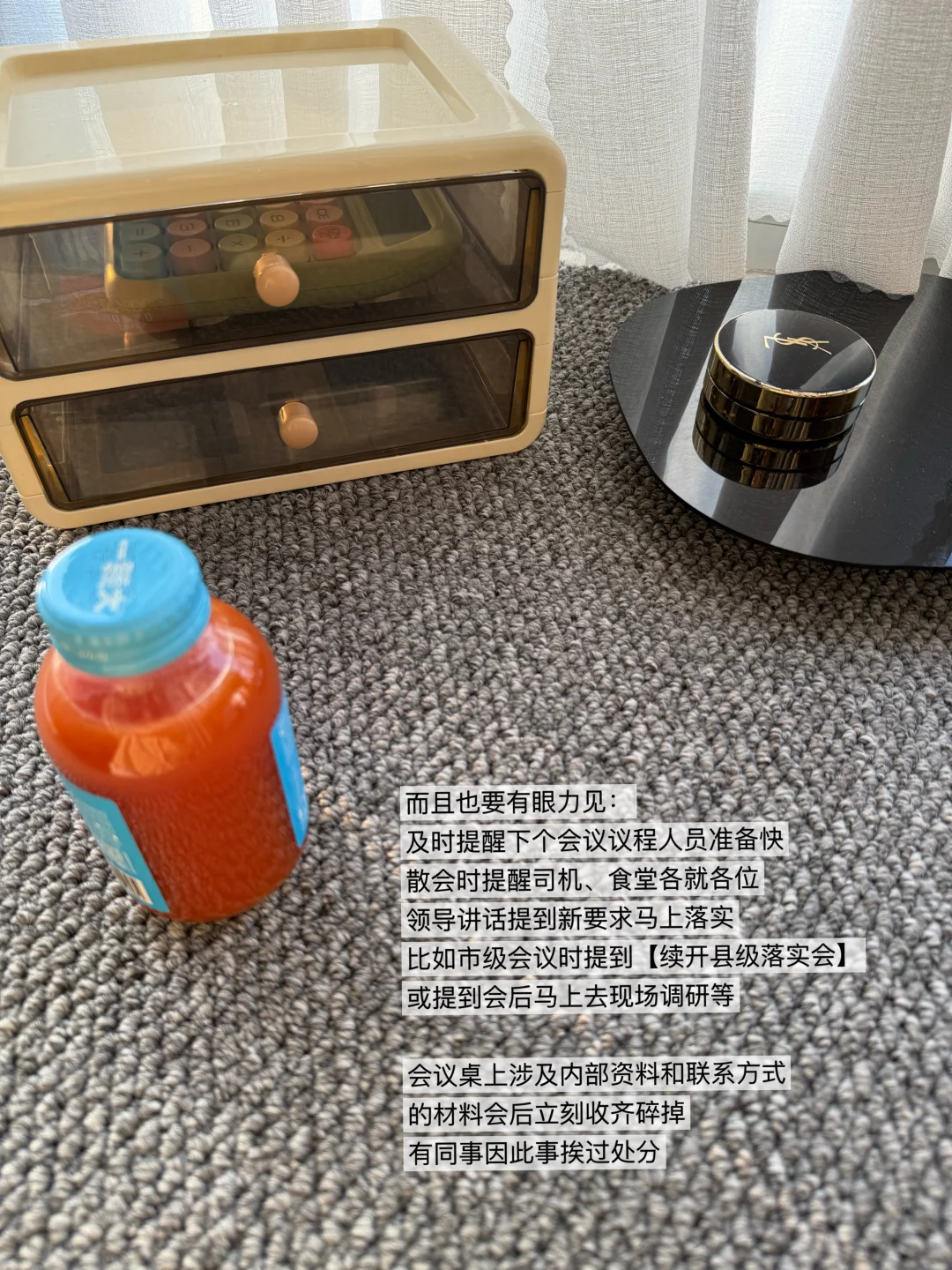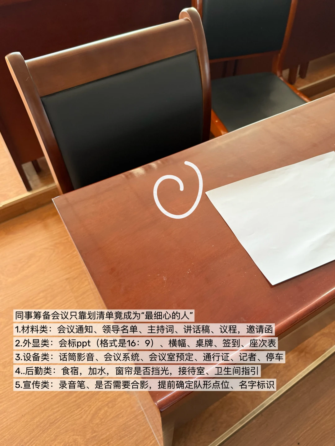 及时提醒下个会议议程人员准备;快散会时提醒司机、食堂各就各位领导讲话环节提到新要求马上落实,比如开市级会议时提到开县级落实会,或提到会后去现场调研等;涉及联系方式的材料会后收齐碎掉,有同事因此事挨过处分。