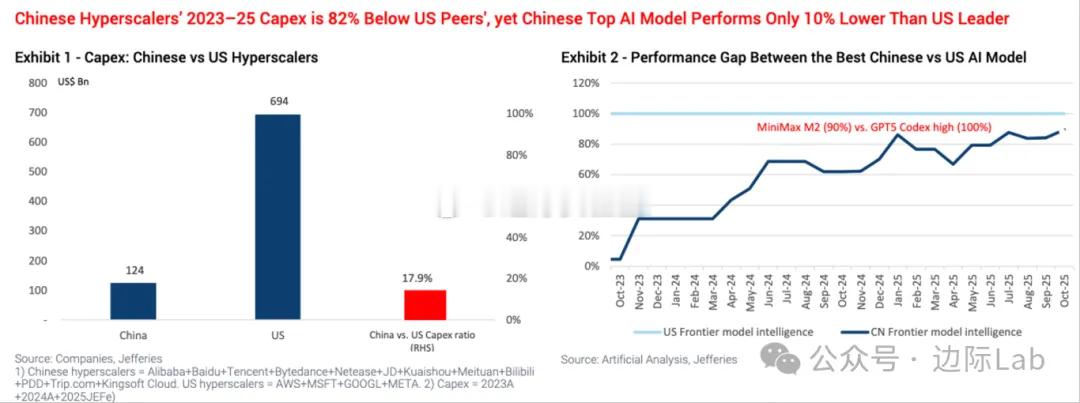 中国人工智能领域的资本投入呈现出显著高于美国的效率,具体数据显示,中国头部科技公司在2023至2025年的合计资本支出(1240亿美元)较美国同业(6940亿美元)低82%,但其最先进的大模型(MiniMax M2)性能与美国顶尖模型(GPT5)的差距已收窄至仅10%。这种资本效率差异的根本原因在于,中国企业受硬件限制及市场环境影响,更侧重于通过提升模型效率和发展开源生态来降低成本,而美国则聚焦于通过大规模资本开支推动模型性能以实现通用人工智能(AGI)。来源:杰富瑞(《中国人工智能的全球背景》,详细内容请见《财经图集》知识星球)