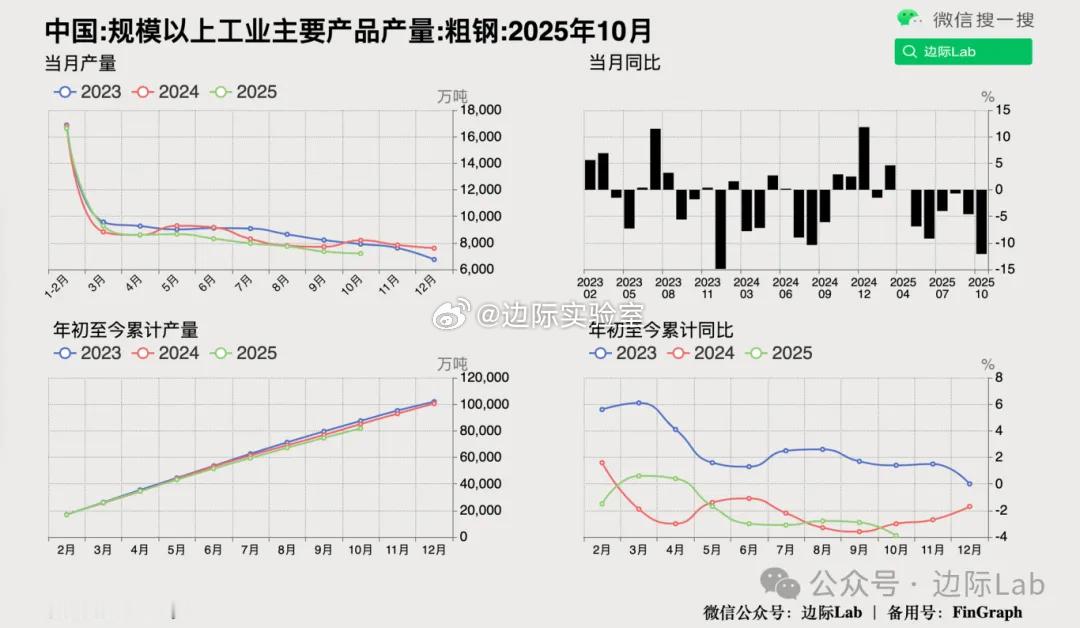受国内需求持续疲软和利润空间收窄的共同影响,中国钢厂在10月份深化了减产力度,推动当月粗钢产量同比下降12%至7200万吨,创下自2021年以来的同期最低水平。房地产市场的长期低迷与制造业活动的放缓共同削弱了订单量,而行业内持续的产能过剩则不断挤压价格,导致钢厂盈利能力恶化。根据Mysteel的数据,样本钢厂的盈利比例已同比下降19个百分点。来源:边际Lab x FinGraph财经图集