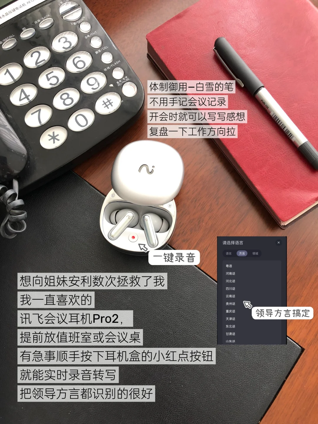 买个贴心小秘书讯飞会议耳机Pro2,提前放会议桌,顺手按下耳机盒的小红点按钮。靠人不如靠工具。这耳机能实时录音转写,领导方言都识别的很好。会后用viaim Ai会议助理生成会议纪要,再用万姆助理辅助做成新闻稿,能顺利完成任务。