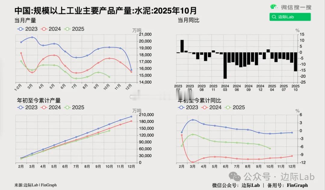 受房地产需求持续走弱影响,10月全国水泥产量降至14775万吨,同比下降15.8%,较上月8.6%的降幅明显加深;拖累今年以来水泥累计产量同比增速扩大至6.7%。来源:边际Lab x FinGraph财经图集