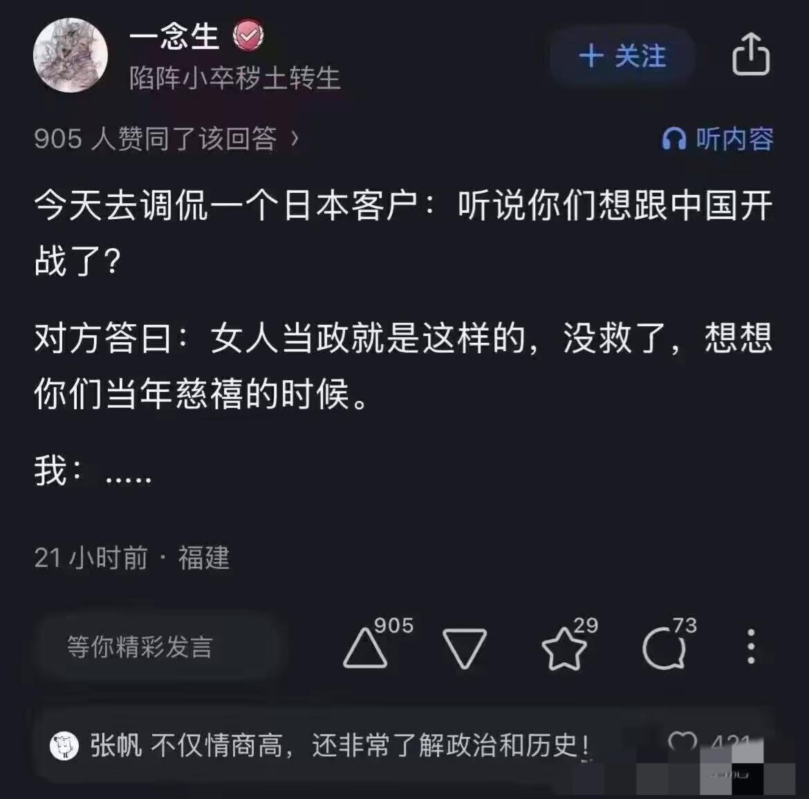 日本客户甩锅“女人当政”?别被带偏,戳穿右翼的真实图谋才管用! 网友调侃日本客户 “想开战”,对方居然扯慈禧甩锅“女人当政”,这借口真是荒唐又可笑 再看日本的操作:外务省拒绝中方所有要求拒不道歉,高市早苗死抱涉台错误言论不撤回,日媒还敢叫嚣击沉中国航母,嚣张背后全是右翼的野心。 高市早苗作为安倍的“政治门生”,一边鼓吹“台湾有事就是日本有事”,一边推动扩军修宪,本质就是想借台海局势突破和平宪法束缚。有人喊着断交、驻军,虽解气但不够精准,咱们手握《波兹坦公告》法理依据,还有对付立陶宛的成熟经验,没必要跟着情绪化。 对付这种揣着明白装糊涂的右翼势力,就得戳穿他们的真实图谋,用精准反制让其付出代价,比单纯嘴炮更有力。 你觉得该怎么精准拿捏日本右翼的嚣张气焰?来评论区聊聊你的高招~