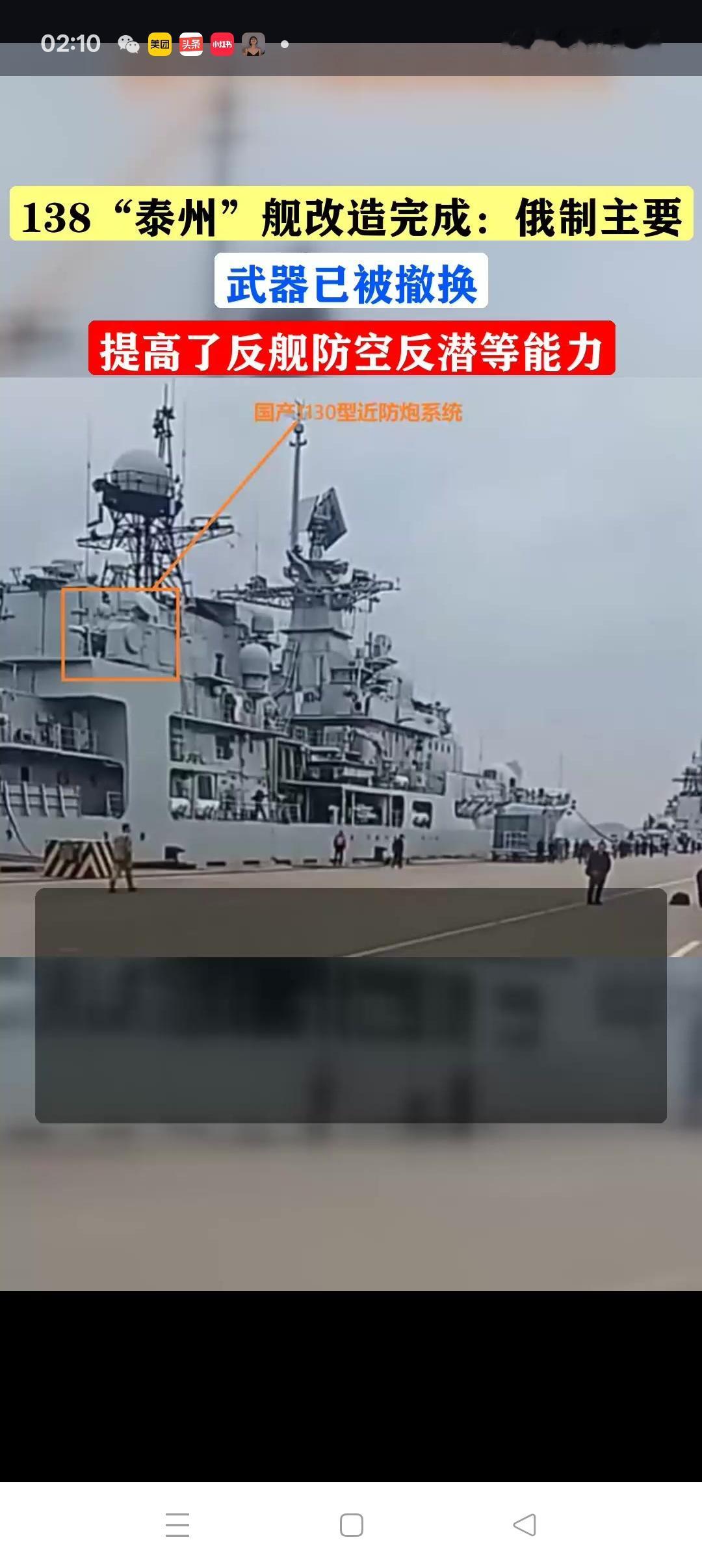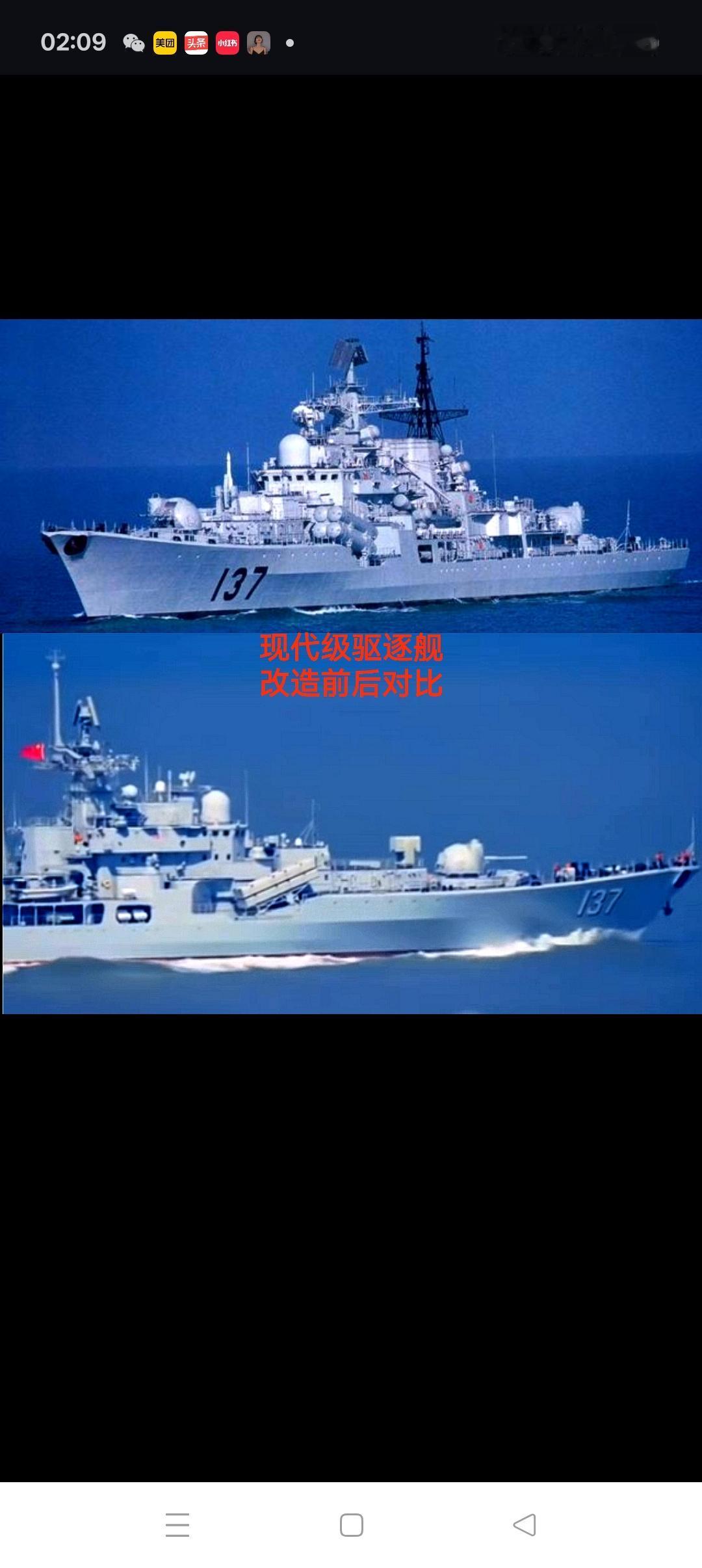 升级改造,为我所用 目前,对引进的现代级驱逐舰136、137、138等3艘舰艇的改造工作已圆满完成。对现代级驱逐舰的现代化改造实现了从俄制装备到国产系统的全面升级,‌作战能力得到显著提升‌。改装后,在反舰、防空、反潜及信息化水平上均实现跨越式发展。‌‌ 一、‌反舰导弹‌ 改装前:配备2座4联装俄制SS-N-22“日炙”超音速反舰导弹,射程约240公里。‌‌ 改装后:换装为2座4联装国产“鹰击”-12超音速反舰导弹,射程增至400–500公里,末端速度达4马赫,突防能力更强。‌‌ 二、‌防空系统‌ 改装前:依赖2座9K90单臂发射架发射SA-N-17“灰熊”防空导弹,备弹量有限,抗饱和攻击能力弱。‌‌ 改装后:拆除单臂发射架,换装48单元H/AJK16型垂直发射系统(VLS),可发射“红旗”-16系列防空导弹,具备区域防空和多目标拦截能力;新增24联装“红旗”-10近程导弹,与1130近防炮形成“弹炮结合”末端防御体系。‌‌ 三、‌近防与反潜武器‌ 改装前:近防系统为俄制“卡什坦”弹炮合一系统,实战表现不佳;反潜依赖533毫米鱼雷和RBU-1000火箭深弹。‌‌ 改装后:近防系统升级为2座国产1130型11管30毫米近防炮(射速超万发/分钟);反潜武器换装324毫米轻型鱼雷发射管,并新增122毫米多功能火箭发射器,与“鱼”-8反潜导弹构成远中近三层反潜火力网。‌‌ 四、电子与信息化升级 ‌雷达与指挥系统‌:改装前采用俄制雷达和电子设备,难以融入中国海军作战体系;改装后换装国产382型三坐标雷达(探测距离提升40%)及新型数据链,实现与航母、预警机等平台的实时数据共享,战场感知能力大幅提升。‌‌ ‌动力与舰体优化‌:保留蒸汽轮机但优化锅炉系统;通过喷涂吸波涂料和加装水雾喷淋系统,降低雷达反射面积和红外信号特征。 五、作战能力与意义 ‌综合作战效能‌:改装后反舰打击范围扩大、防空抗饱和能力增强、反潜网络立体化,综合作战能力接近052C/D型驱逐舰水平。‌‌ ‌战略价值‌:改造标志着中国海军彻底摆脱对俄制核心系统的依赖,实现老旧平台与国产作战体系的深度融合,为东海舰队主力舰持续赋能。‌‌ 对泰州舰等现代级驱逐舰的成功改造,至少说明了以下3个方面的问题: 一是中国已走完引进、消化、吸收国外先进装备的历程。今后将进入以自我建造、自我创新为主的新阶段,即便少数适用的、性价比高的、确实领先的装备引进的话,消化、吸收其精华也是顺手拈来。 二是目前中国的技术与装备水平己大大超越了当年出口装备国家的水准。中国也才有能力换装更先进的装备,对其进行脱胎换骨的升级改造。 三是中国也具有对引进装备系统性中式翻修的技能,不但能提升装备的作战效能,而且还能使所引进的装备通过系统性的改造,完全融入中国自身的装备作战体系内,华丽转身为真正意义的“中式装备”而为我所用。