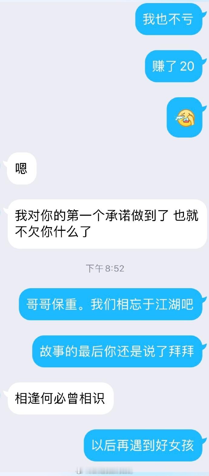我和杀猪盘吴迪的爱情故事(10)大结局篇!当我唐晓娟和吴迪再次谈到金钱时,又吵了起来 其实我本想用爱感化吴迪,让他不要再当骗子了,结果他不领情。最后我们大吵一架,相忘于江湖!唐晓娟的故事就这样结束了,哎,我其实有点后悔,当时收尾太突然了,应该把他培养成电子宠物,有事没事就逗一逗