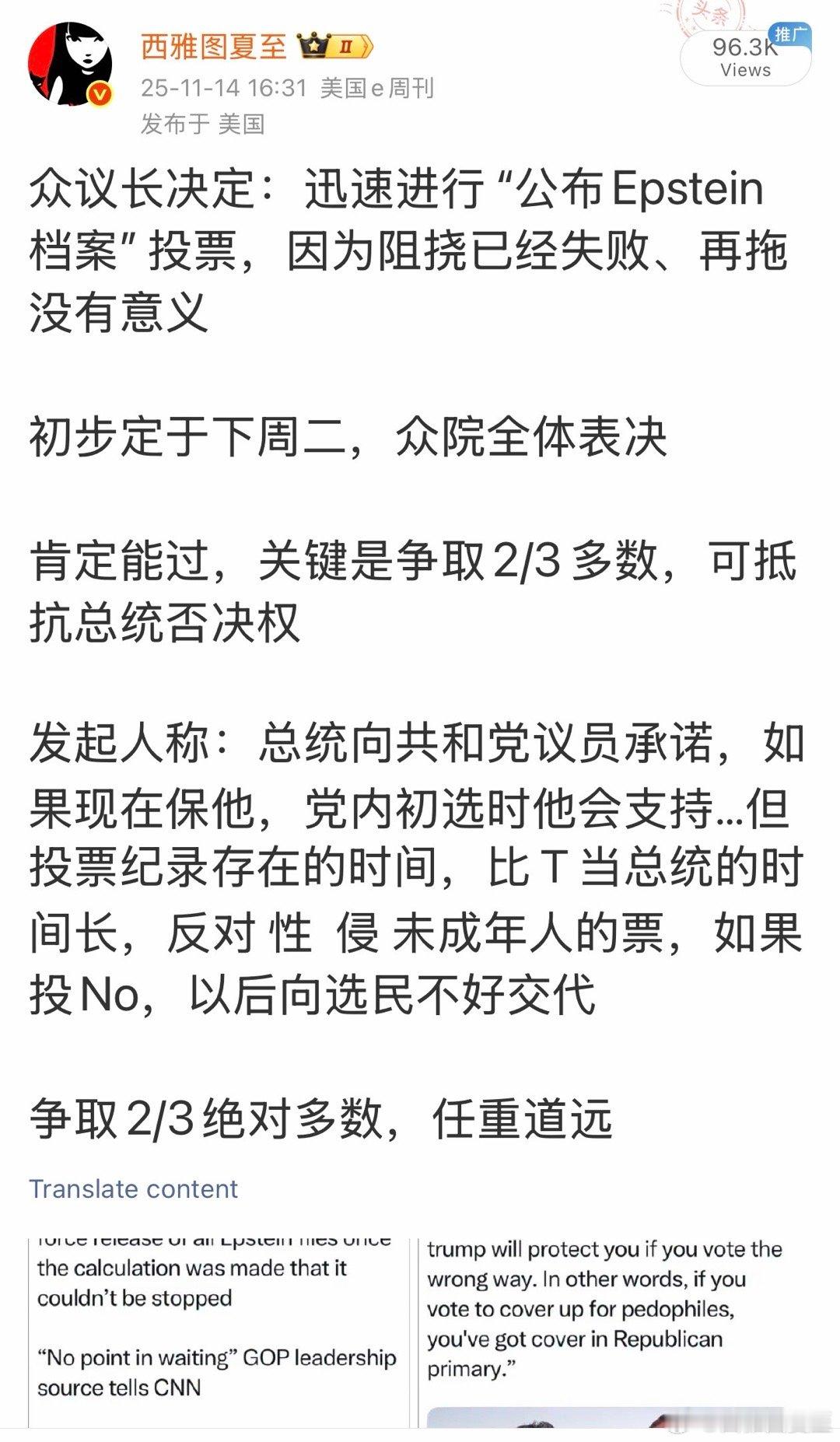 今天,众议院就“公布Epstein档案”投票表决昨天,总统在白宫:支持共和党议员投✅,如果参院也通过,会签字态度急转弯,因为本党民意明朗,已经拦不住变被动为主动,要求司法部“严查”,因为“和Epstein有染的都是民主党”