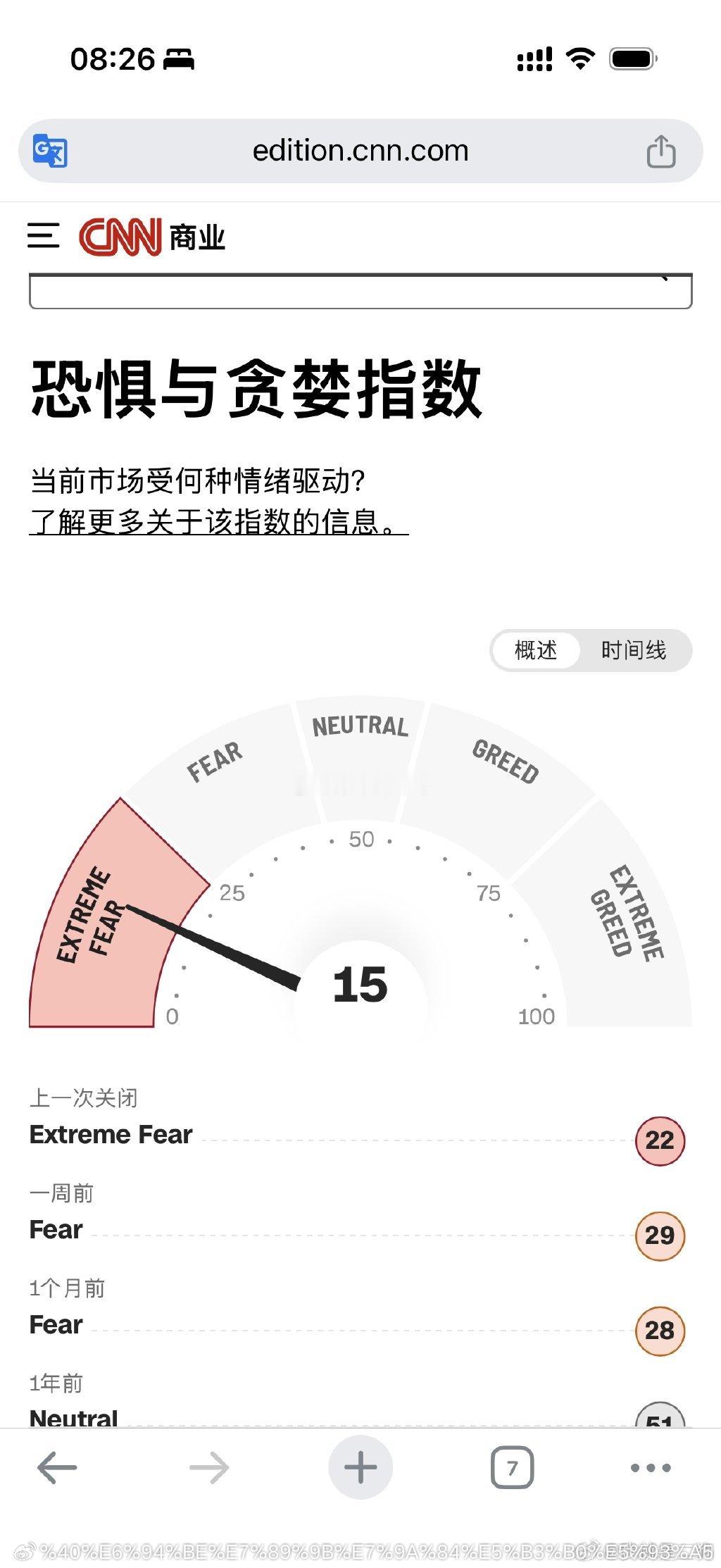 贪婪恐慌指数进入极度恐惧区间,分值15,上次四月最低是4。可以说很接近了。