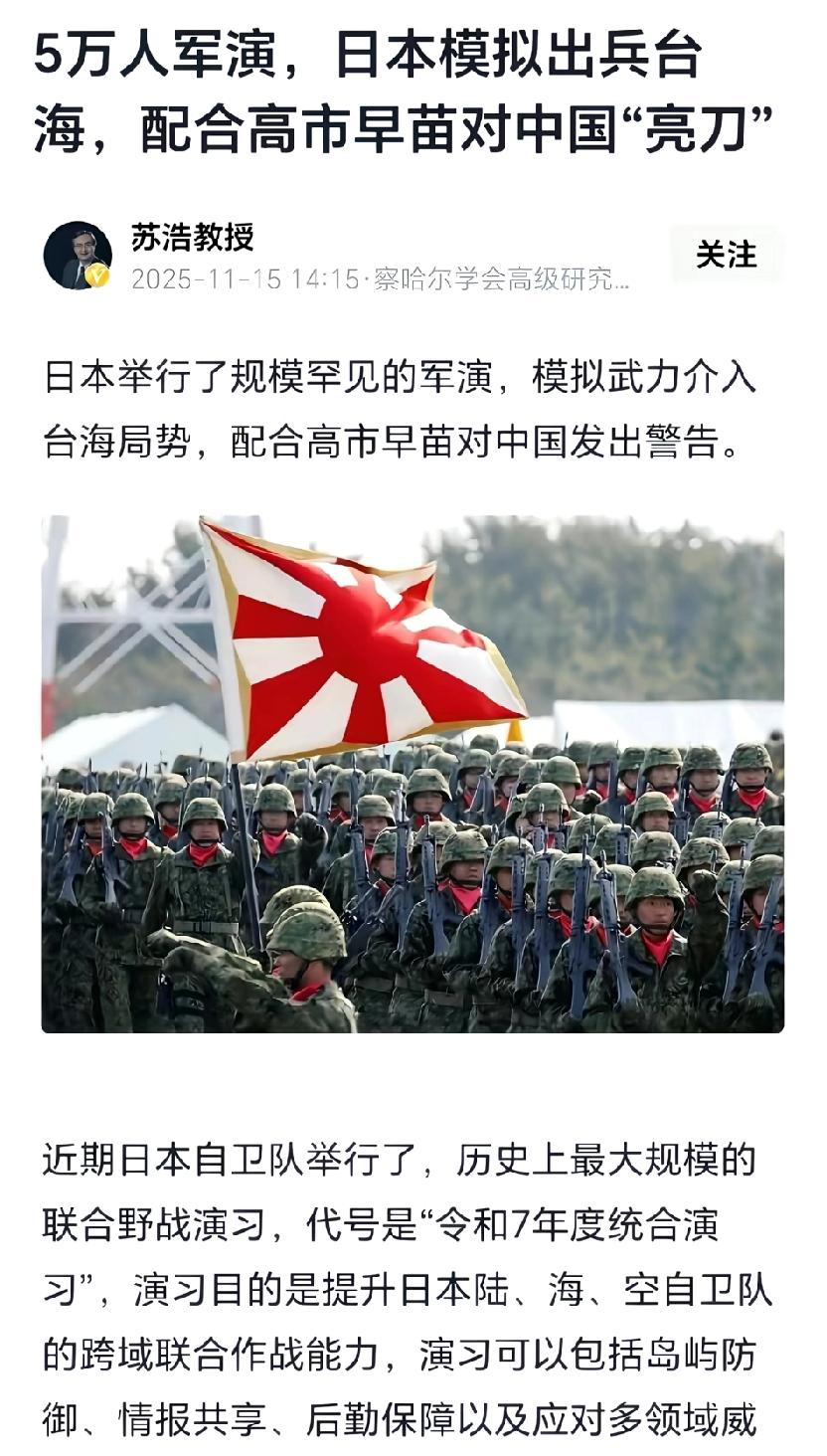 日本举行了规模罕见的5万人军演,日本模拟武力介入台海局势, 配合高市早苗对中国“亮刀” 如果日本介入台海战争,那便是公然对我国领土发起侵略战争,我国有权对日本土发动袭击。这次不会像老一辈这么仁慈放他们回去了,一定让他们有来无回。 宁为战死鬼,不作亡国奴,面对现实不可怕 ,忘记历史才可恨,还是碰碰吧,东风5C申请出战,保证一战定乾坤