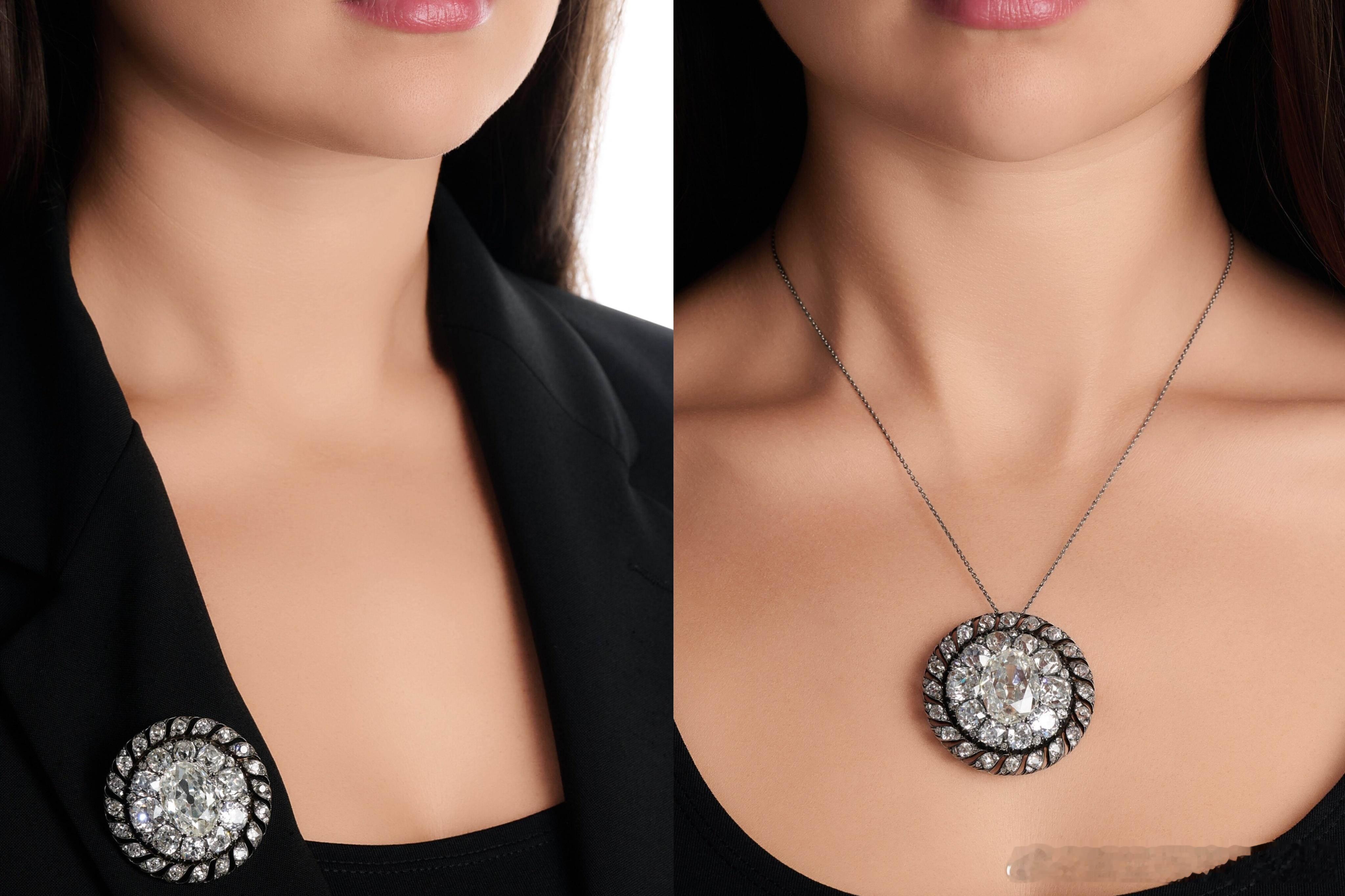 法国皇帝拿破仑一世的圆饼钻石胸针/吊坠,大约制造于1810年,珠宝主石是一颗重约13.04克拉的椭圆形钻石,主石周围环绕着近100颗形状大小各异的老式切割钻石并排列成两排同心圆。圆饼钻石胸针/吊坠相传是拿破仑一世用来装饰双角帽的帽饰,1815年,拿破仑一世的军队在滑铁卢战役中被英普联军击败,他在急于跑路的途中因马车深陷泥泞而不得不弃车逃生,车上的珍贵的个人物品随即被扔下,其中就包括这件胸针/吊坠,之后该珠宝被普鲁士军队缴获并当成战利品献给国王弗雷德里克·威廉三世,同时成为普鲁士王室的藏品被霍亨索伦家族收藏了两百多年。圆饼钻石胸针/吊坠于本月12日在苏富比日内瓦拍卖行出售,虽然拍卖行并没有透露卖家身份,但依旧拍出巨高的价格,估计为10w~20w瑞士法郎,成交价为352.7w瑞士法郎,足足翻了十几倍。