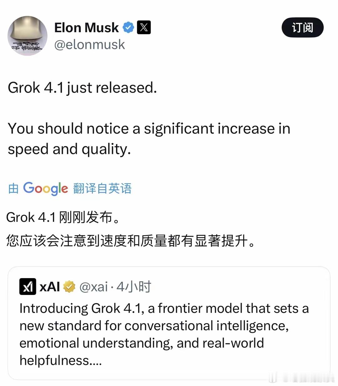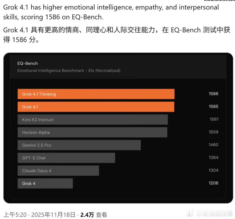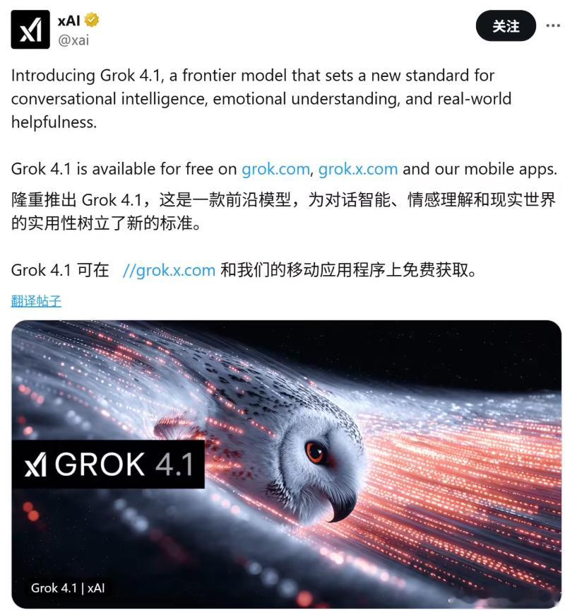 马斯克放大招:Grok 4.1亮相,迎战GPT-5.1!11月18日,马斯克旗下xAI扔出重磅炸弹——Grok 4.1震撼发布。这次的新版本不只是简单升级,而是直接对标GPT-5.1,在情感互动领域发起强势挑战。据介绍,新发布的Grok 4.1堪称"脱胎换骨",不仅保留了原有的犀利风格,更在创造力、情感理解和互动交流上实现质的飞跃。它能精准捕捉用户的每一个细微情绪,让对话不再是冷冰冰的问答,而是真正有温度、有灵魂的交流。性能表现也不俗:幻觉率直接从12.09%暴跌至4.22%,准确率大幅提升。在国际权威测试中,Grok 4.1的Thinking模式以1483分登顶榜首,非推理模式也以1465分稳居第二,实力碾压一众对手。目前该版本已面向 grok.com、X 平台以及iOS、Android 应用的所有用户开放,包括免费用户,并在 Auto 模式中默认启用。GPT-5.1方唱罢,Grok 4.1又登台,马斯克跟OpenAI的奥尔特曼算是较上劲了。在Grok 4.1官宣发布后,马斯克立即转发了消息,提醒人们予以关注。