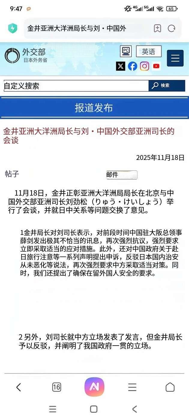 外交部亚洲司司长刘劲松与记者对话。 记者:今天(与金井正彰的)会谈你觉得满意吗? 刘劲松:当然不满意。 记者:气氛怎么样? 刘劲松:严肃。 从这几句简单问答中可以得出一个结论:金井正彰在会谈中并没有像他与刘劲松走在一起时那样卑微。日本没有收回高市早苗恶劣言论的意思,而且是来提出抗议个要求的,并暗示要求撤换薛剑总领事。猖狂。