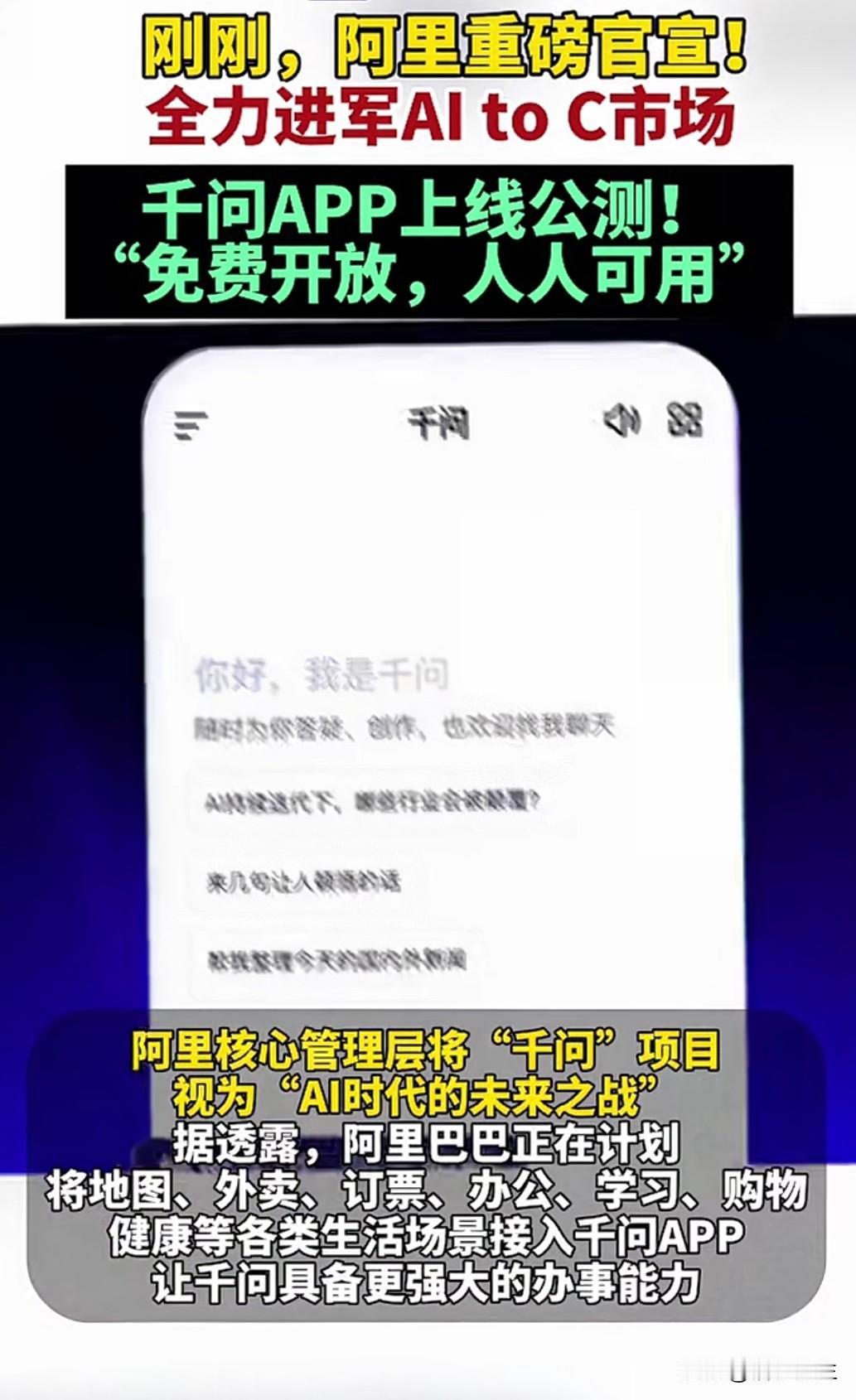 阿里千问APP公测上线,直接叫板ChatGPT!这款AI大模型产品不仅免费开放,还宣称"人人可用",引发行业高度关注。这标志着国内AI大模型竞争进入白热化阶段。阿里凭借其技术积累和生态优势,有望在AI领域占据一席之地。但ChatGPT已深耕市场多年,用户粘性较高,千问APP能否实现超越,仍需时间检验。对普通用户而言,多了一个优质AI工具选择;对行业而言,阿里的入局将加速AI技术创新和应用落地。这场AI领域的"龙争虎斗",最终受益的将是广大用户。