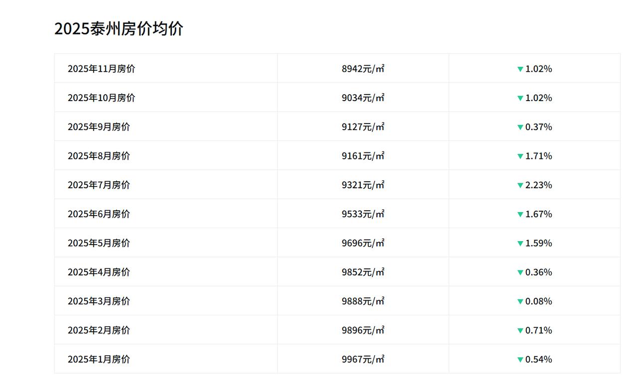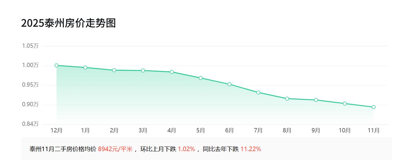 2015年10月,江苏泰州房价均价7055元; 2016年10月,江苏泰州房价均价6831元; 2017年10月,江苏泰州房价均价9211元; 2018年10月,江苏泰州房价均价10277元; 2019年10月,江苏泰州房价均价10838元; 2020年10月,江苏泰州房价均价11388元; 2021年10月,江苏泰州房价均价13241元; 2022年10月,江苏泰州房价均价12385元; 2023年10月,江苏泰州房价均价11450元; 2024年10月,江苏泰州房价均价10212元; 2025年10月,江苏泰州房价均价9034元。 泰州十年房价的曲线,像是某股票的涨跌图,2016到2018年是泰州楼市的黄金三年,房价从不到7千冲到1万以上,尤其2017年同比涨幅达34.8%,当时市场上是一天一个价。 2021年房价达到历史高点,从2022年开始,房价开始回调,连续回调三年,目前价格已回到2017年末的水平。 泰州房价下跌的原因很简单,市场信心和宏观经济大环境变了。老百姓的预期从“买房肯定赚”变成了“再看看会不会更便宜”,很多人都处于观望状态。 眼下,市场正在寻找新的平衡点。对于刚需的人来说,这或许是一个难得的政策窗口期和价格窗口期。但一定要记住,房子最终还是用来住的,能满足你生活需求、品质过硬的好房子,才会永远有价值。