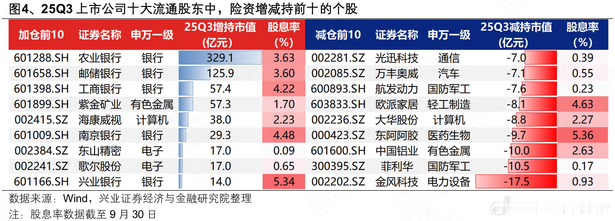 截至三季度末保险资金共持有股票3.62万亿,基金1.94万亿,权益资产总规模5.56万亿,权益资产的比例提升至14.85%的历史最高水平。25Q3险资增持农业银行329亿,其次是邮储银行和工商银行。和险资一起抱团取暖?🤣🤣