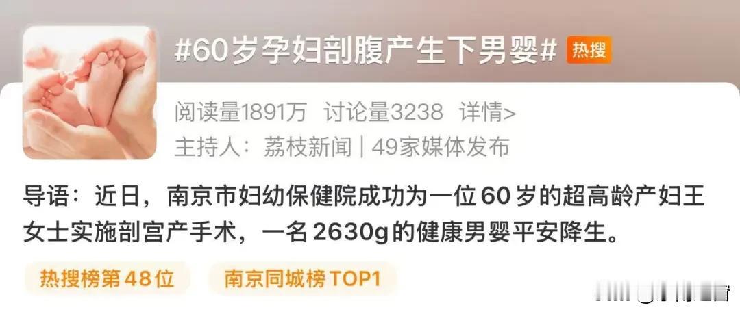 60岁冒死剖腹产!失独家庭最后的倔强,伟大还是自私? 60岁的王女士真把“母爱”卷到极致了!三十多岁的独子不幸离世,她和同龄丈夫揣着满心执念,靠辅助生殖硬怀上孩子,顶着疤痕子宫、子痫前期、心律失常的多重风险,在南京妇幼剖腹产下2630g男婴,医院多学科团队全程护航才没出意外。 但咱说实话,这哪是“生命奇迹”,简直是拿两条命赌!医生反复强调超高龄生育致命风险翻倍,麻醉、产后出血都可能要命,这案例根本不能复制。更现实的问题在后头:孩子10岁时父母都70岁了,精力、经济能力能不能跟上?等孩子成年,父母都快80岁,养老和养育的双重压力全压在孩子身上,这何尝不是一种隐性负担? 母爱确实伟大,但伟大不该以冒险为代价,更不能忽视孩子未来的成长困境。这种极端案例看看就好,真没必要盲目跟风,对自己和孩子负责才是真的爱!