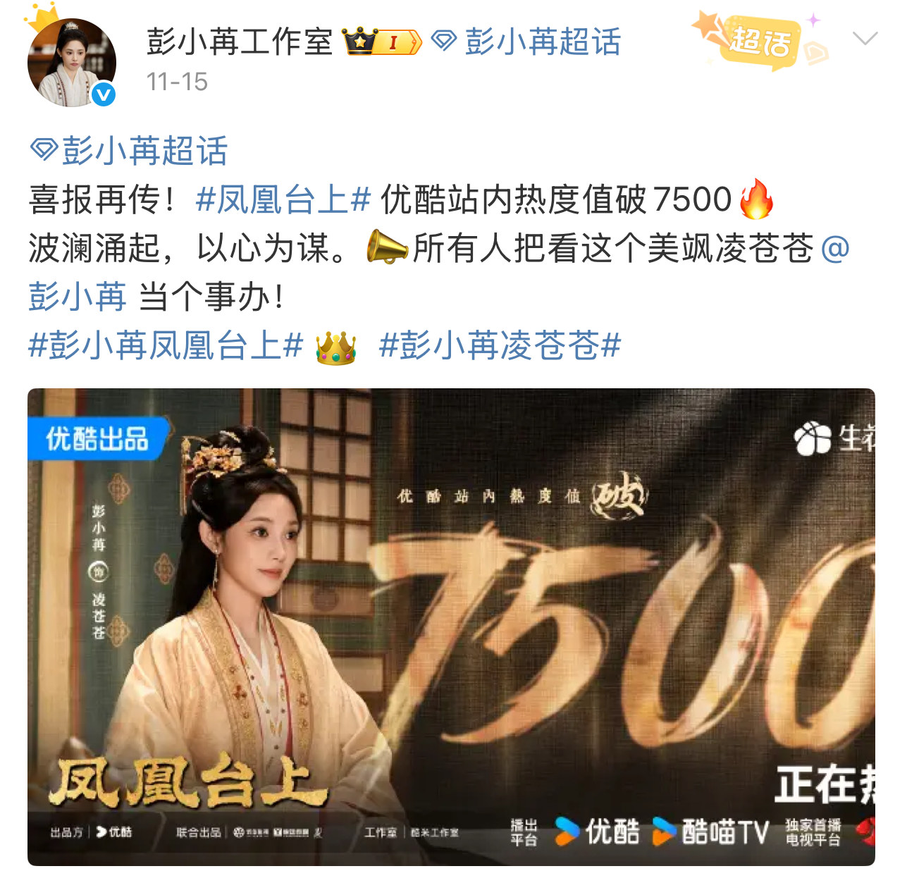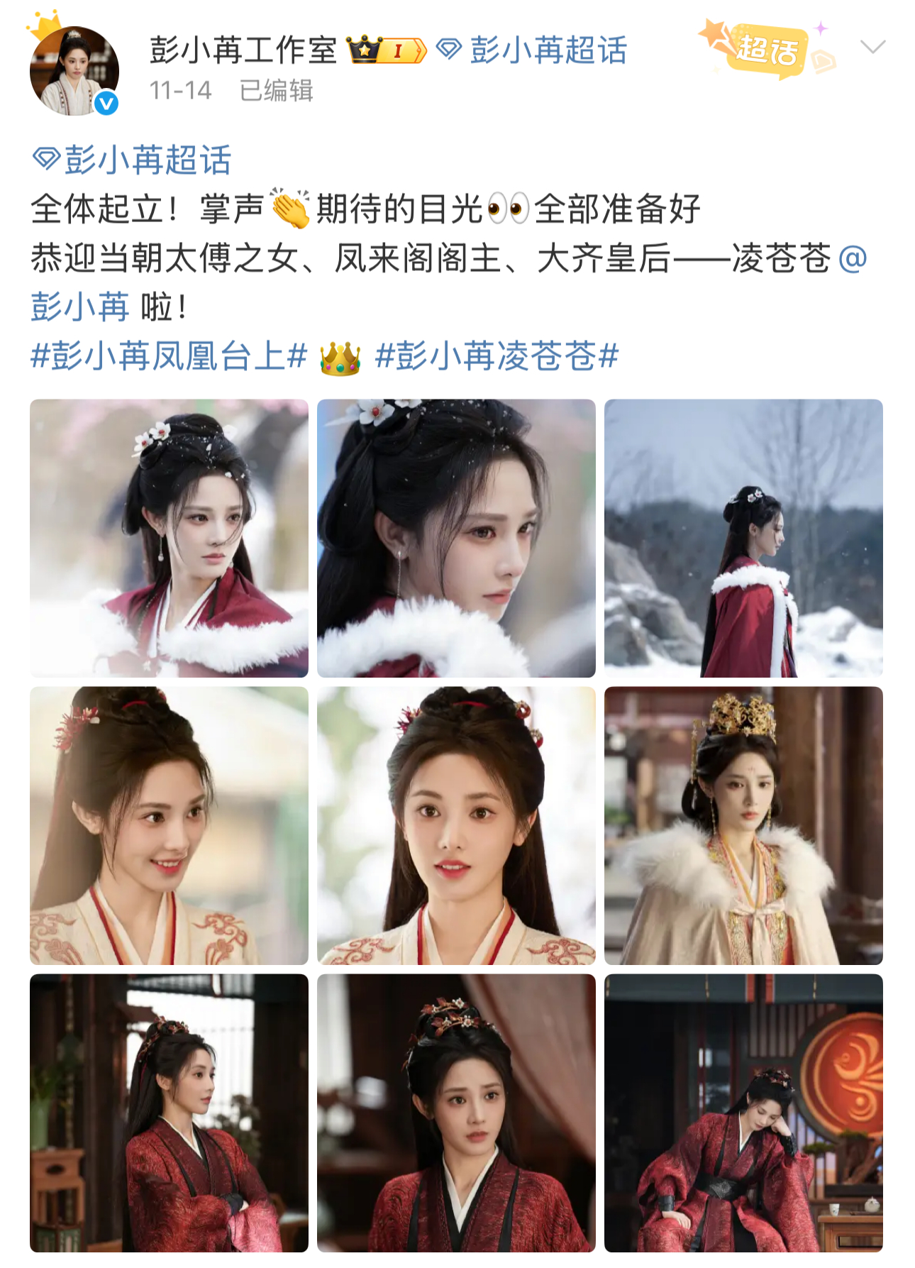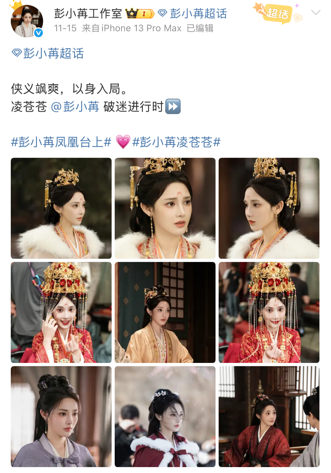 建议内娱工作室都像彭小苒工作室一样卷起来,新剧播出4天就发了23组物料,有战报,有探班,有花絮,还有姐的日常,就这样的营业速度别停!!我知道你累但我建议别停!!