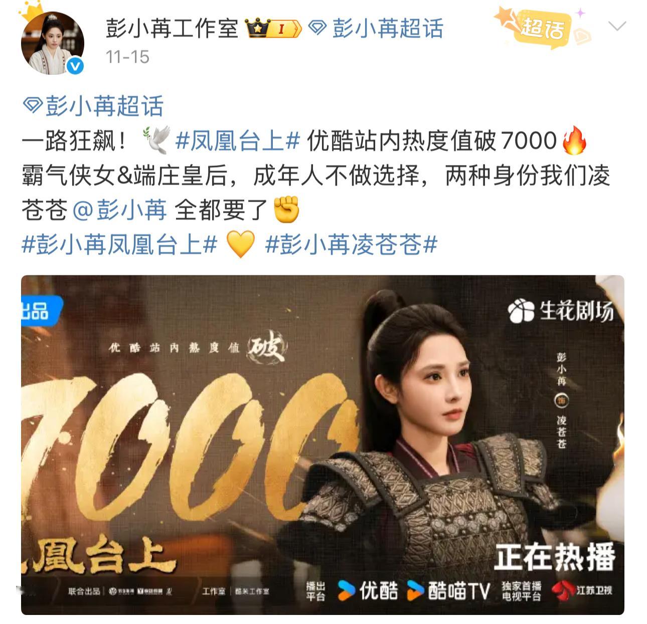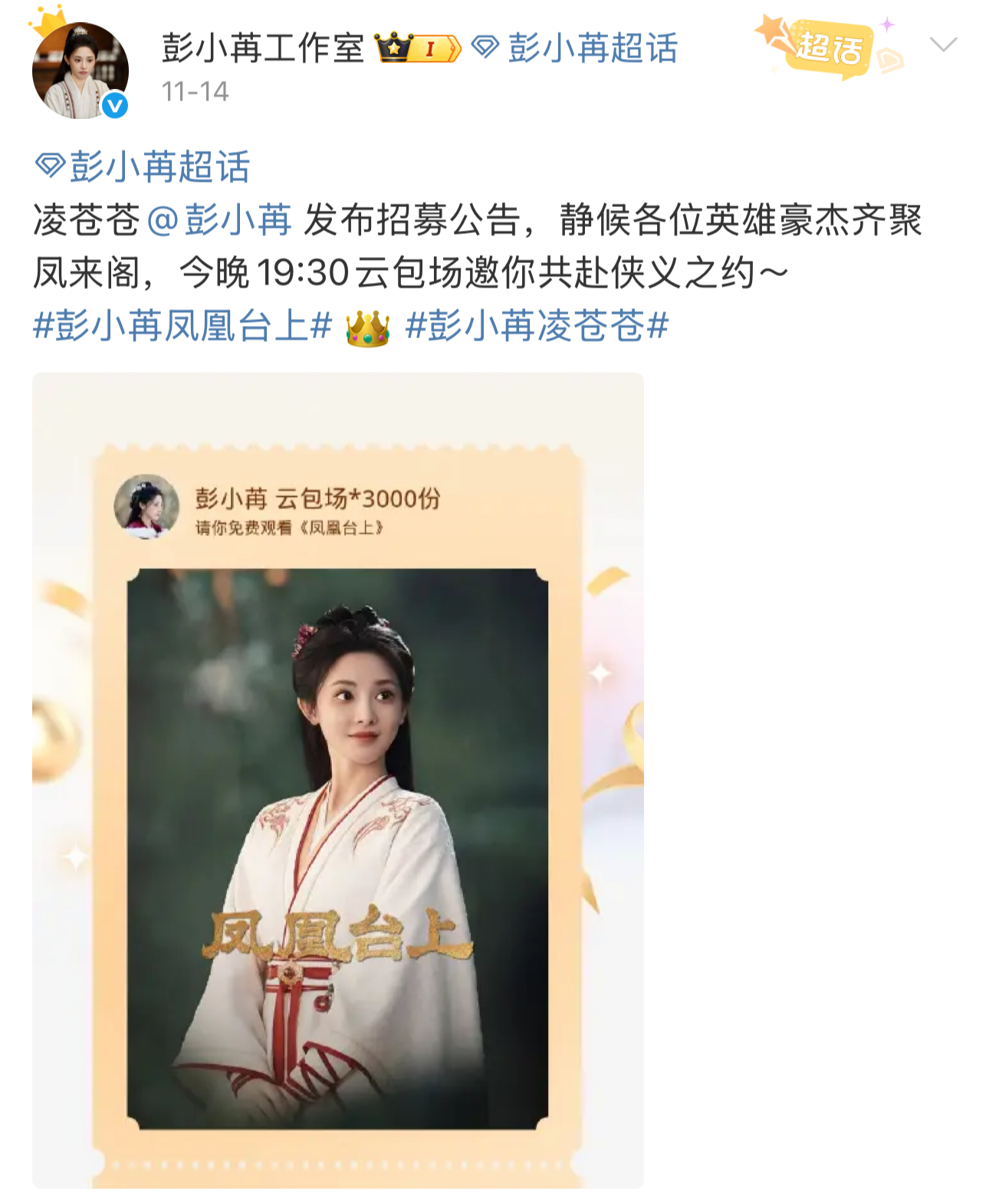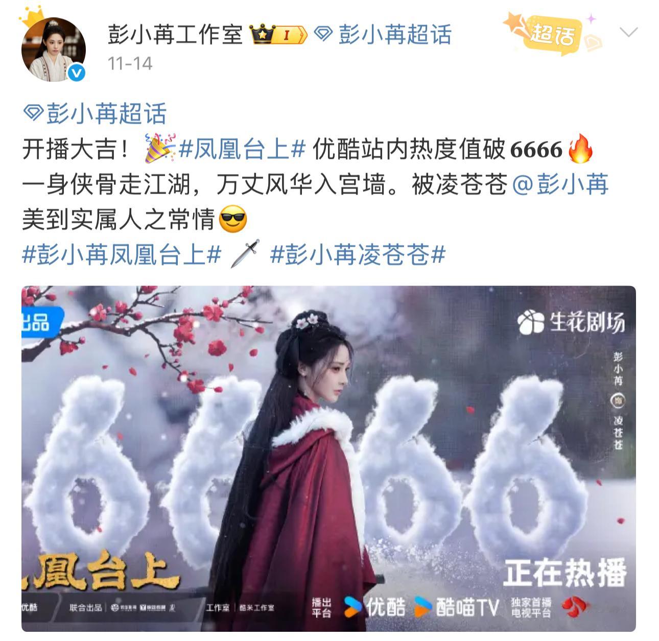 建议内娱工作室都像彭小苒工作室一样卷起来,新剧播出4天就发了23组物料,有战报,有探班,有花絮,还有姐的日常,就这样的营业速度别停!!我知道你累但我建议别停!!