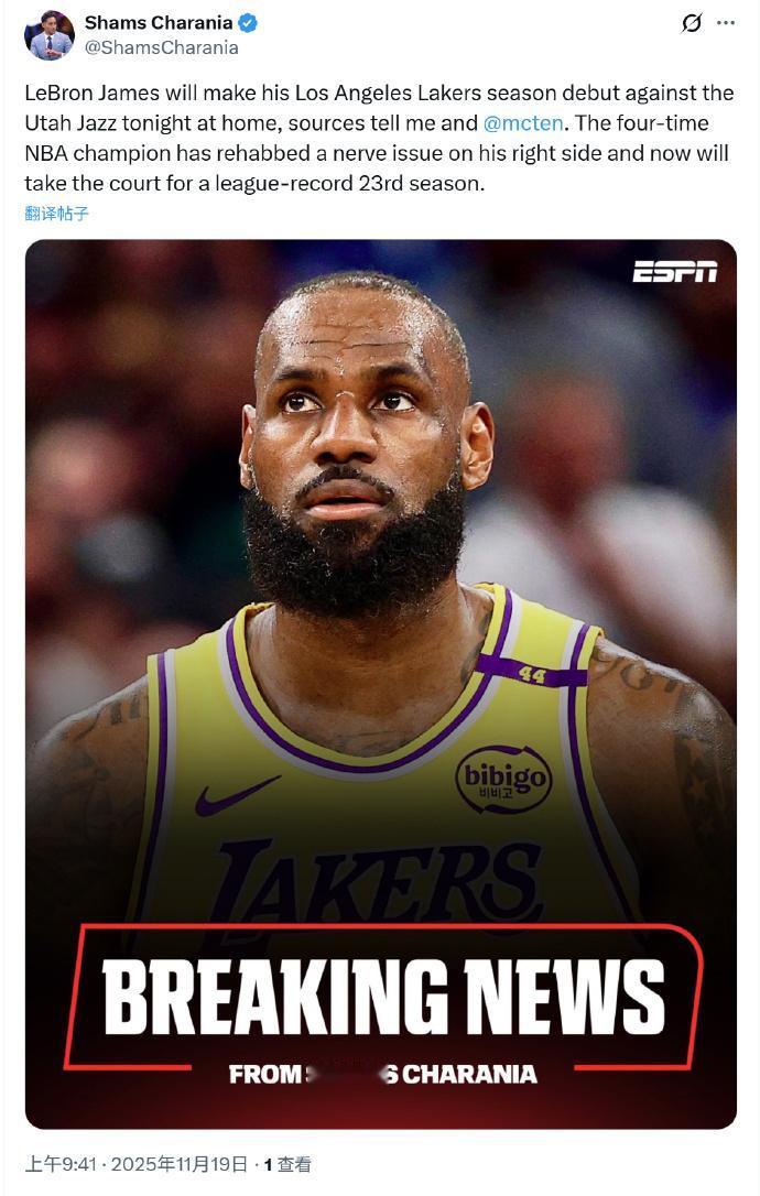 NBA:詹姆斯明天有望复出开启职业生涯第23个赛季。 湖人队官方发布了明日对阵爵