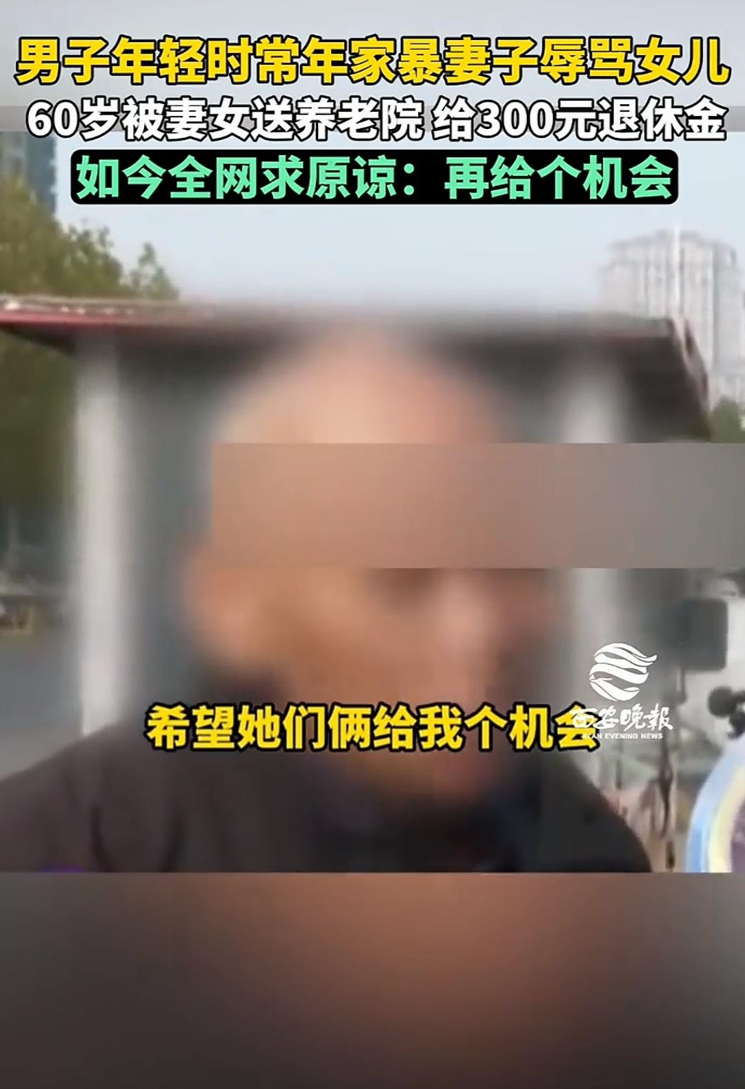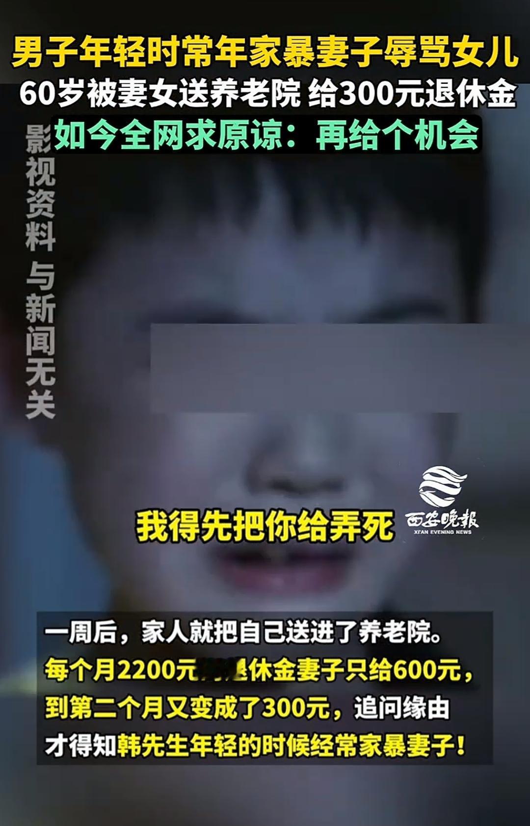 河南许昌,11月14日的韩先生坐在轮椅上向媒体求助,说因为和妻子吵架被妻女送进了养老院,他每月有2200元退休金,但第一个月妻子只给了他600元,第二个月更是降到了300元,面对镜头,他语气诚恳,表示愿意改正,希望一家人能重新团聚。[害羞] 可随着记者深入了解,故事的另一个版本慢慢浮现。 原来韩先生年轻时经常对妻子动手,女儿回忆说从她记事开始,父亲打母亲就是家常便饭,“喝醉了拿起酒瓶就往我妈头上砸”,这场景深深印在她脑海里。 更让她心寒的是父亲曾拿着刀朝她走来,还说过“先把你弄死”这样的话,从那一刻起女儿心里就不再把他当父亲看待。 这场养老院风波背后,藏着这个家庭几十年来难以愈合的伤痕。 当韩先生坐在轮椅上渴望亲情时,他期待的宽容对妻女来说,却是重新撕开旧伤口,女儿选择保护年迈的母亲,这个决定得到了很多网友的理解。 看了这个新闻,真是让人心里五味杂陈家家有本难念的经。 “这大爷现在坐轮椅上知道后悔了,早干嘛去了?拿酒瓶子砸老婆头、扬言要弄死亲闺女的时候,怎么不想想老了谁管你?妻女还能出钱给他送养老院,已经算以德报怨了,要我说这母女俩算仁至义尽,那每月300块就当是给他留点零花不欠他的。” “清官难断家务事,但家暴永远是零容忍的底线,女儿那句话听着真叫人心疼——‘当他敢拿着刀站起来往我身边走的那一刻起,他就没有把我当女儿’,这种恐惧和伤害是一句‘我改’就能抹去的吗?晚年凄凉是他自己年轻时一手造成的。” “从法律角度看子女对父母确实有赡养义务,但如果父母曾对子女有严重侵害行为,比如长期家暴甚至生命威胁,法律上也会考虑减轻或免除子女的赡养责任,这位父亲的行为恐怕已经超出了普通家庭矛盾的范围。” “这正应了那句老话,天道好轮回,年轻时不积德老了难免受苦,他曾经是家里的‘暴君’,如今失去力量才渴望亲情,但有些伤痕太深不是一句道歉就能愈合的,母女俩能让他有个地方住,有基本生活保障,已经需要很大的勇气和宽容了。” “我身边也有类似例子,邻居大爷年轻时对老婆孩子不好,老了病了没人愿意贴身照顾,最后也是去了养老院,所以说善待家人,其实就是给自己积攒晚年的福气人在做天在看。” 如果您是这位妻子或女儿,您会选择原谅并接他回家,还是维持现状?面对一个曾经深深伤害过你、如今衰弱的家人,您觉得最好的处理方式是什么?欢迎在评论区分享您的观点。 信源:河南广播电视台民生频道