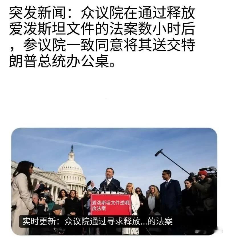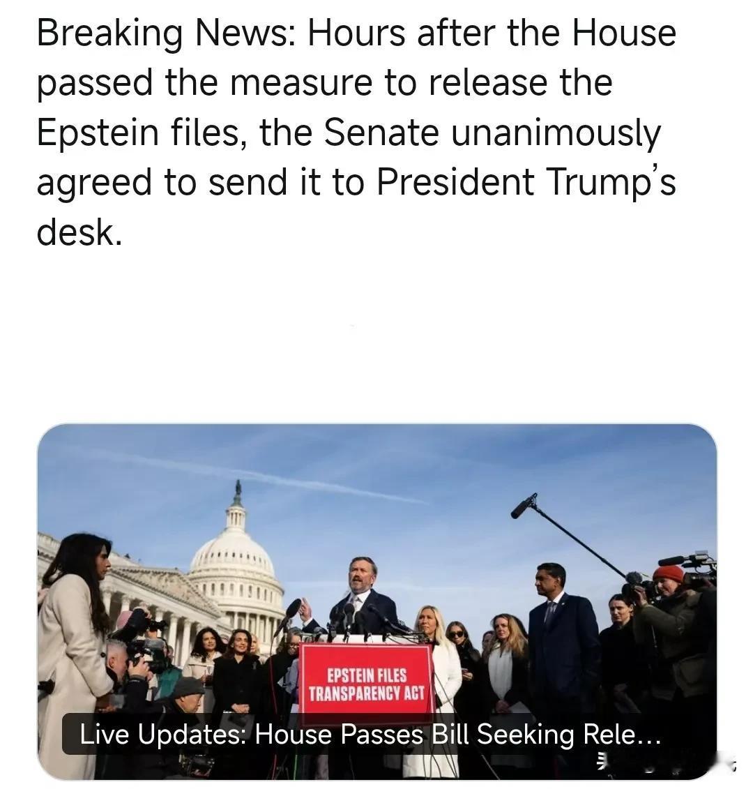 众议院通过公布爱泼斯坦档案的法案数小时后,参议院一致同意将其送交特朗普签署。