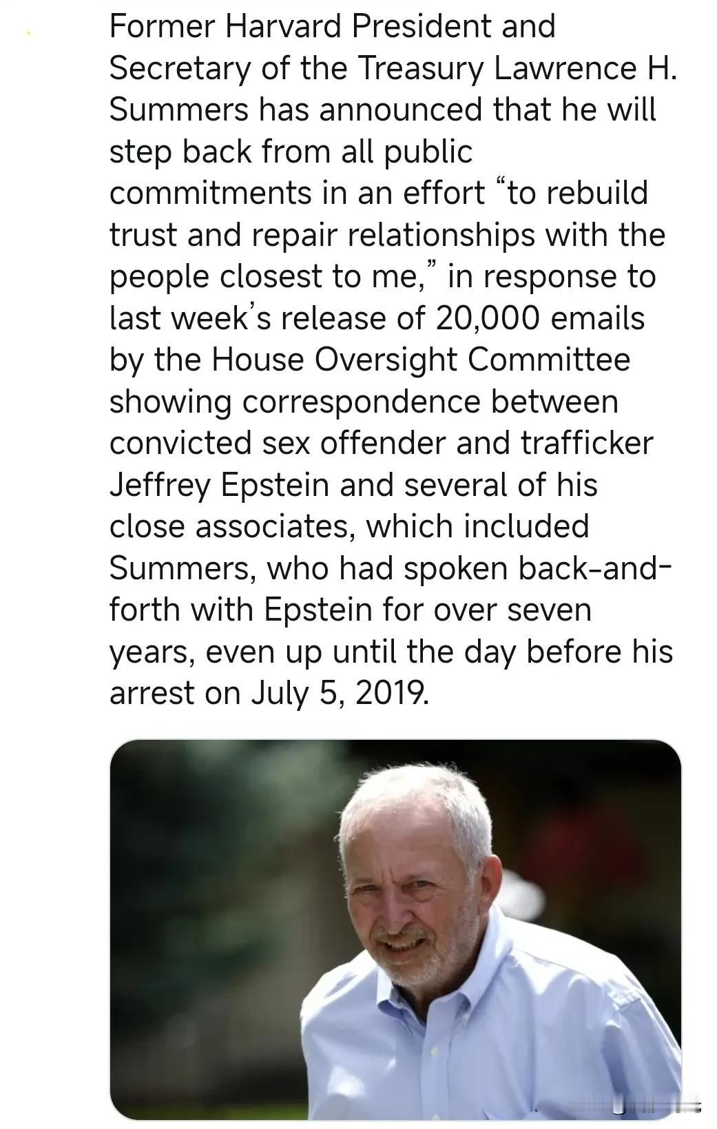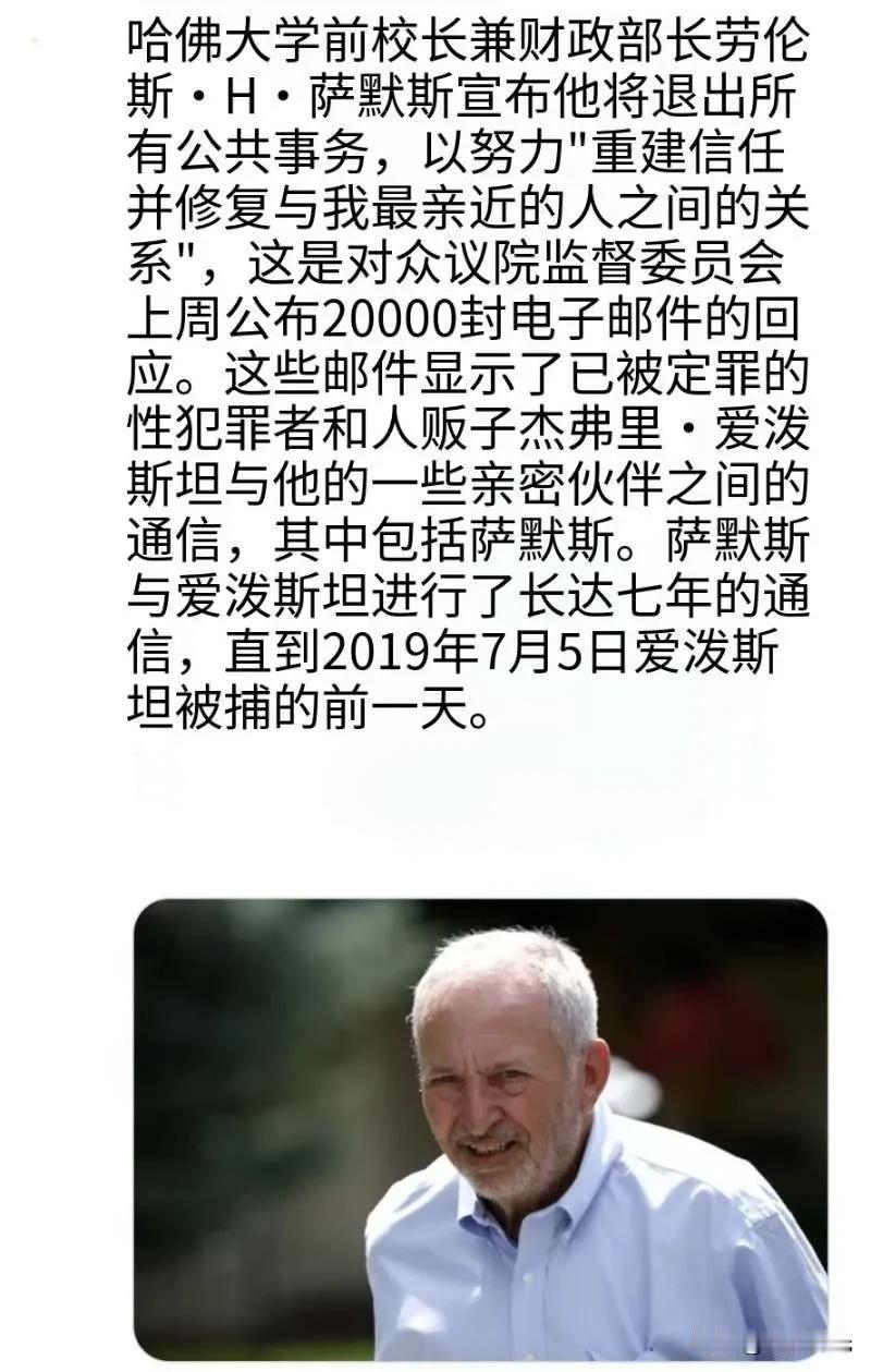 前哈佛大学校长兼财政部长劳伦斯·H·萨默斯宣布,他将退出所有公共职务,以“重建信任,修复与我身边最亲近的人的关系”。 此前,众议院监督委员会上周公布了 2 万封电子邮件,这些邮件显示了被定罪的性犯罪者和人口贩运者杰弗里·爱泼斯坦与其几位亲密伙伴之间的通信,其中包括萨默斯本人。萨默斯曾与爱泼斯坦来回通信长达七年多,甚至在 2019 年 7 月 5 日爱泼斯坦被捕的前一天仍有联系。