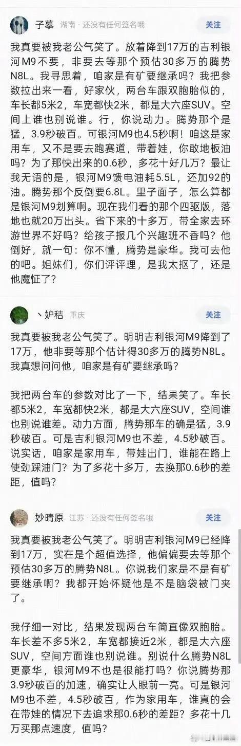 腾势N8L:“我被攻击了?这是个什么情况?咋就突然把枪口对准我了呢?我这也没卖多少啊!我到底威胁到谁了?” 尊敬的友商们,请问你们是感受到什么威胁信息了吗?居然连一款刚上市的车也不放过,它既没有公布订单量,也没有公布周销量,同时它销量也非常一般,为啥非要置它于死地? 清一色内容,修改一下文字顺序就是一编帖子,你们不要告诉我纯属巧合哈?[灵光一闪]