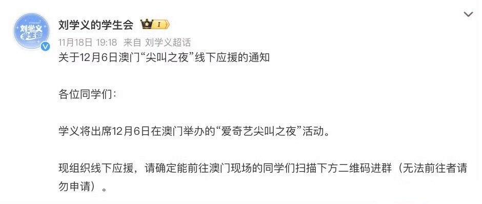 刘学义暂定出席12月6号爱奇艺尖叫之夜,期待学义的红毯