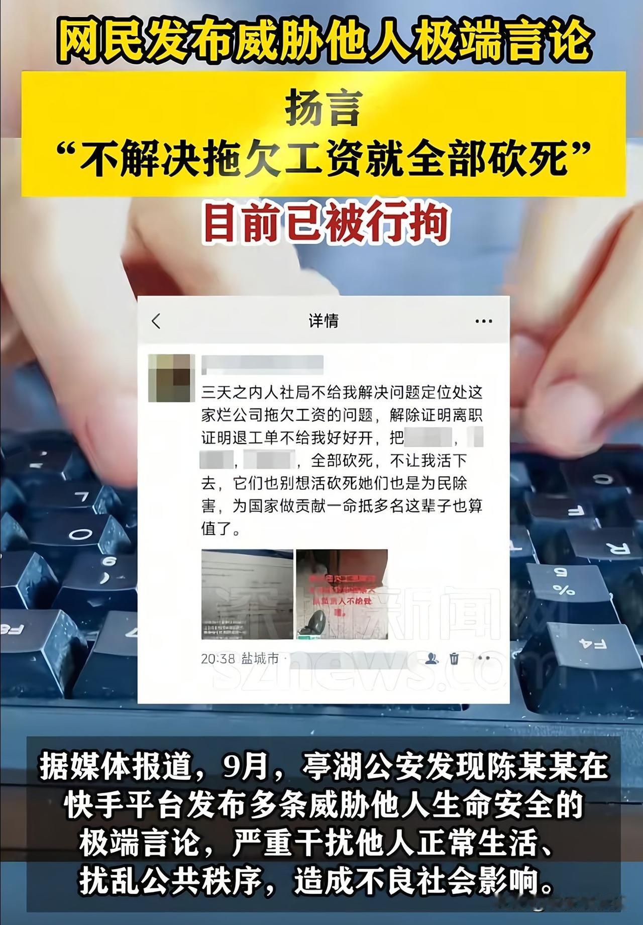 现在网络上关于拖欠工资的谣言和过激言论可不少。就像浙江义乌的兰某,为博眼球发“老板没给工人工资,被杀掉了”的假视频,造成不良影响,被依法处罚。宜都的向某更离谱,编造“男子被拖欠工资砍杀法官”的谣言,移花接木抹黑司法机关,也被依法行政拘留。 这次有网民发布不解决拖欠工资就全部砍死的言论被刑拘,也是同样道理。互联网不是法外之地,虽说拖欠工资问题让人愤怒,但不能靠造谣和过激言论解决,还可能让自己吃牢饭,大家上网还是得守法啊。