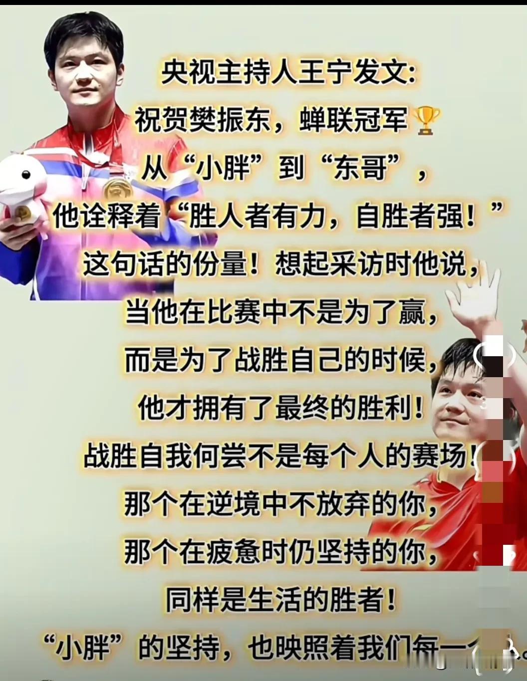主持人王宁的话,大概就是对樊振东的最好的赞誉。 她之前采访过小胖,这次全运会又发文盛赞他,很让人感动。 四次全运会,四次进单打决赛,还都拿了冠军,从“小胖”变成大家口中的“东哥”,樊振东,真的是凭实力一步步拼出来的。 “胜人者有力,自胜者强”这句话说的特别好,因为樊振东比赛的最高境界就是为了战胜自己。 赢别人靠的是能力,能不断超越自己才是真的强大。 樊振东,球打得好,人也踏实,有内涵,真的,好像没有人不喜欢他吧?[呲牙]
