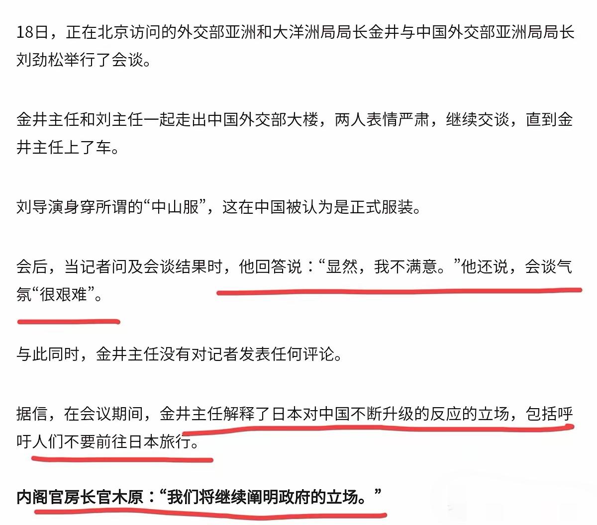 中日会谈之后,日本出来表态了!11月18日,根据日本NHK报道,中国外交部亚洲司司长刘劲松与日本外务省亚洲大洋洲局局长金井正彰会谈后,日方明确表示不改变原有立场,这番表态让中方直言不满。 会谈的核心矛盾早已埋下。11月7日,日本首相高市早苗在国会公然宣称,“台湾有事”可能构成日本行使集体自卫权的“存亡危机事态”,直白暗示将武力介入台海问题,这是战后日本最高级别领导人首次发出此类挑衅。 面对中方严正交涉,日方的回应毫无诚意。内阁官房长官木原稔只强调台海稳定对日本安全重要,通篇不提一个中国原则,更无反对“台独”的表述,反而试图用“继续解释”蒙混过关。 刘劲松司长直接亮明态度:显然,我不满意。会谈气氛的艰难,恰恰说明日方根本没有撤回错误言论的打算,反而在变相坚持干涉中国内政的立场。 要知道,中日四个政治文件早有明确规定。1972年《中日联合声明》中,日方明确承认中华人民共和国政府是中国唯一合法政府,充分理解和尊重台湾是中国领土不可分割的一部分,这是受国际法约束的郑重承诺。 日方的挑衅已经付出代价。中方已暂停赴日团队旅游、取消多项文化交流活动,日本野村综合研究所测算,这将导致日本GDP拉低0.36%,损失约2.2万亿日元,18日东京股市更是一度下跌3.3%。 国际社会也站在正义一边。联合国发言人明确援引2758号决议,重申一个中国原则,指出任何挑战这一共识的行为都是违背国际秩序。日本国内也不乏反对声音,前首相石破茂批评该言论“近乎宣称台湾有事就是日本有事”,鸠山由纪夫直言其目的是煽动危机。 更值得注意的是,高市内阁已陷入外交困境。执政不到一个月,就因涉台、领土问题同时遭到中、俄、朝、韩四国集体批评,俄罗斯直指其奉行“复仇主义”,朝鲜直接拒绝其会晤提议。 其实金井正彰11月17日紧急访华,本质就是危机公关,想阻止中方反制升级。但日方既不撤回错误言论,又不恪守历史承诺,这种“只解释不改正”的态度,根本无法平息事态。 网友们看得很清楚:“台湾问题是中国内政,轮不到日本指手画脚”“承诺不能当空话,挑衅必然要付出代价”“中方的反制精准有力,就该让日方知道红线碰不得”。 中方已经仁至义尽,给了日方纠正错误的机会。如果日方执迷不悟,继续在台湾问题上越线玩火,中方的反制必将进一步升级,从人员交流延伸到经贸等更核心领域。 历史和国际法都早已明确,台湾是中国不可分割的一部分。任何国家妄图干涉台海事务,都必将遭到坚决反制,也必然会自食苦果。日方该清醒了,恪守承诺才是唯一正确的选择。 文章描述过程、图片都来源于网络,涉及版权或者人物侵权问题,或有事件存疑部分,联系后即刻删除或作出更改