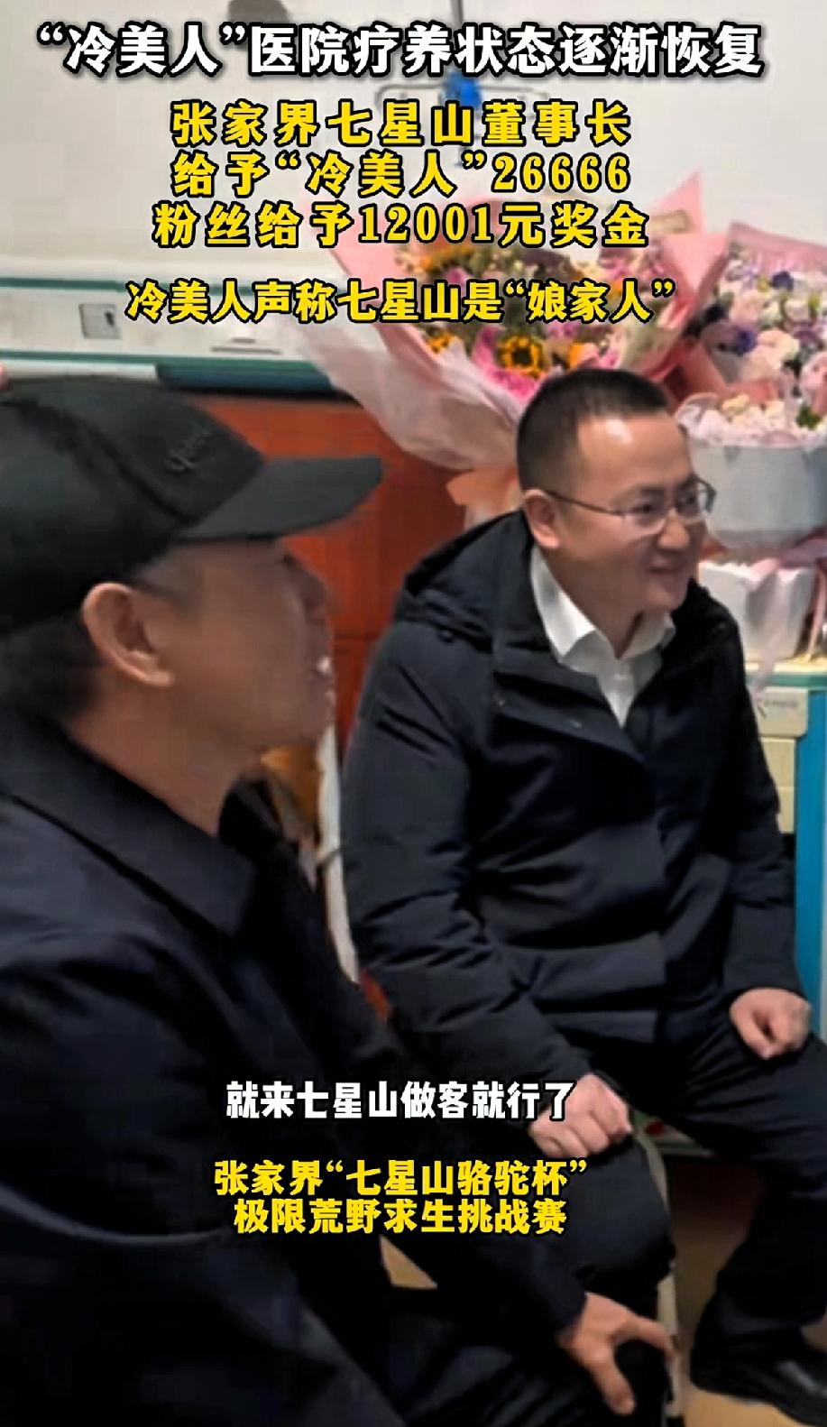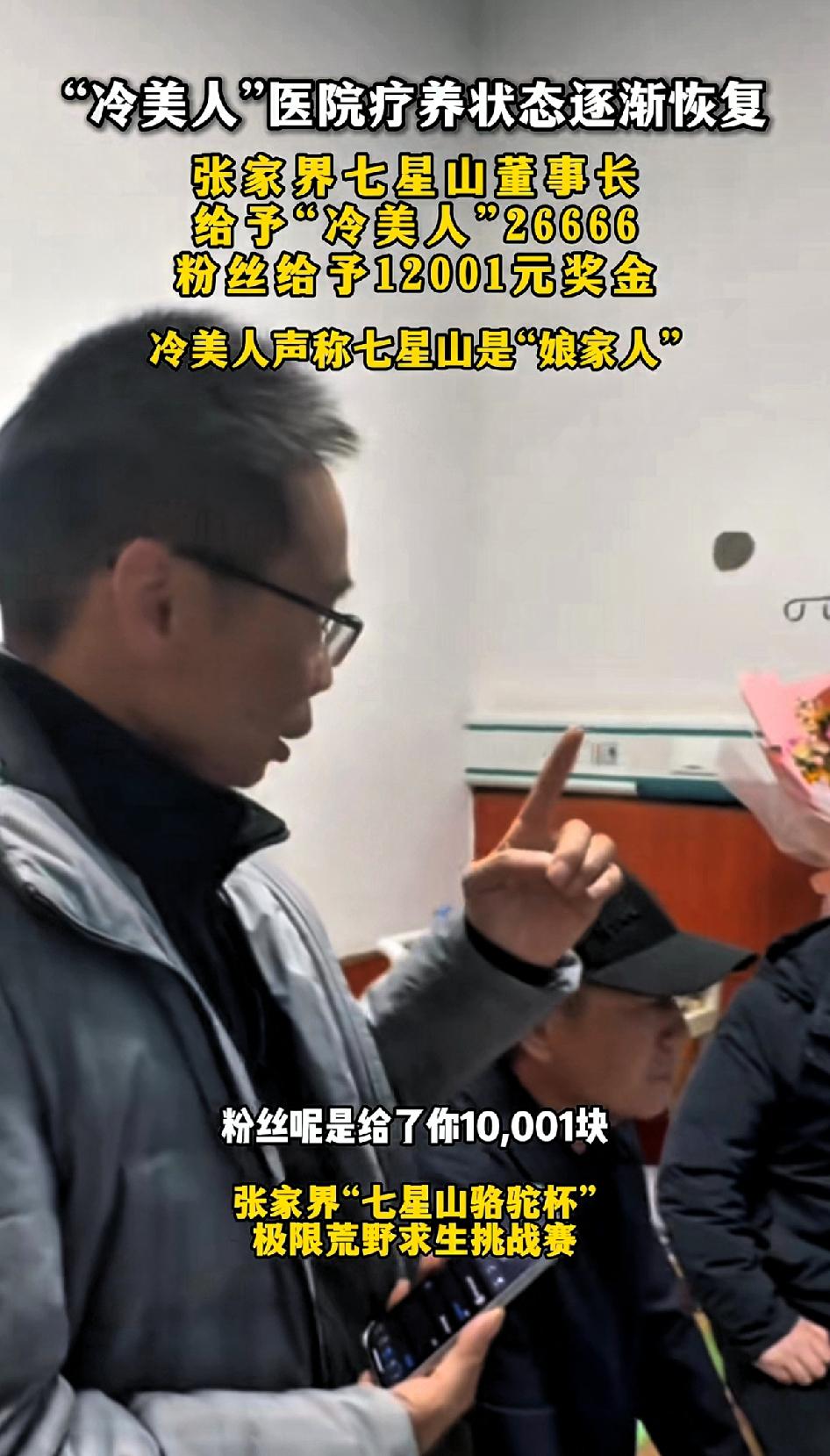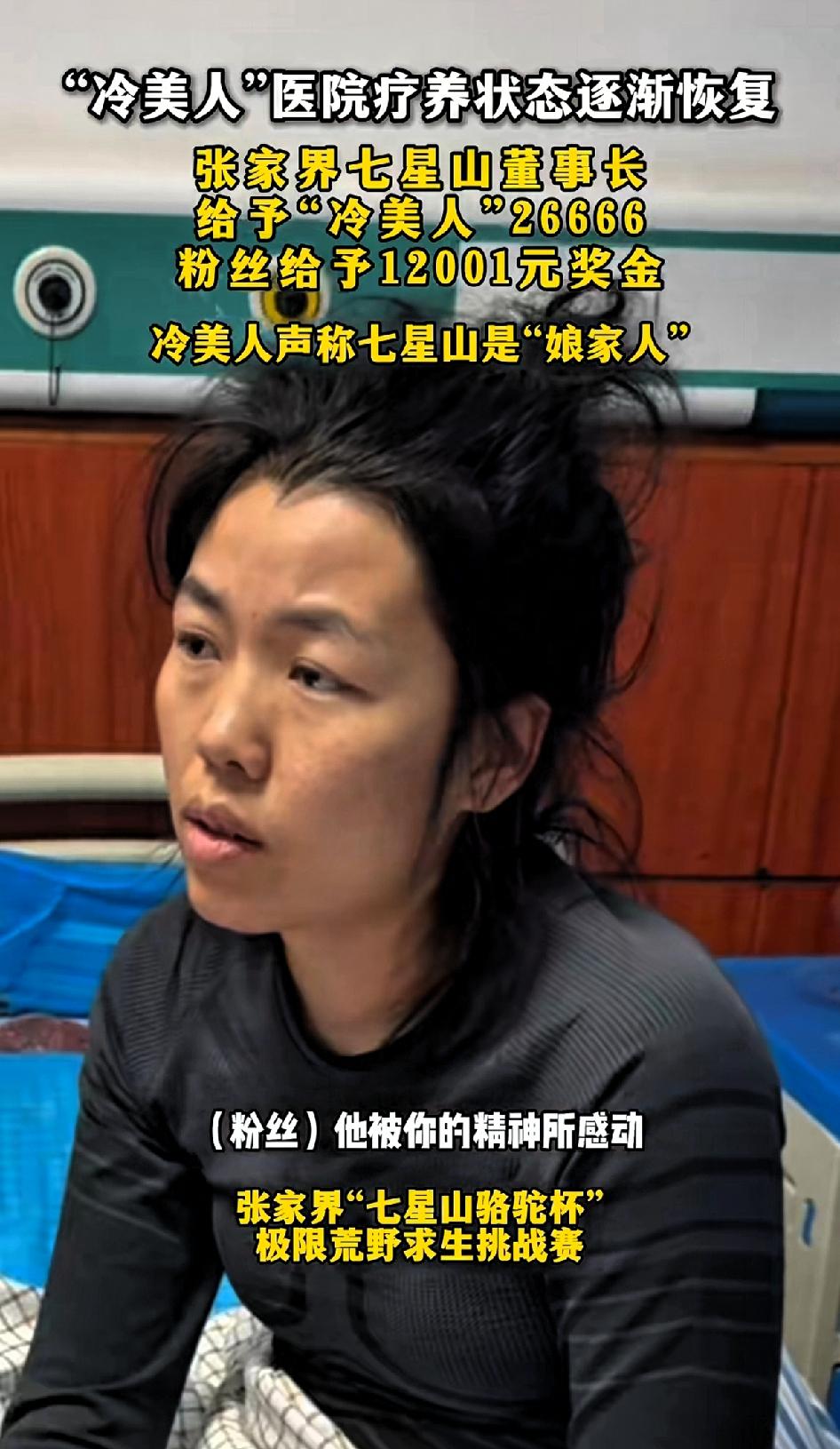 “冷美人”医院疗养逐渐恢复,张家界七星山董事长给予“冷美人”26666元,粉丝被冷美人的精神所感动给予12001元奖金。 董事长称“冷美人”是“荒野求生比赛”女性选手组冠军。 七星山随时欢迎“冷美人”来做客。 “冷美人”称7七星山是自己的娘家人 “冷美人”在医院疗养期间需要的费用全部由赛事公司承担。 几天的时间“冷美人”脸额两侧凹陷已经没那么明显了!虽然头发还在打结,但精神状况很不错。