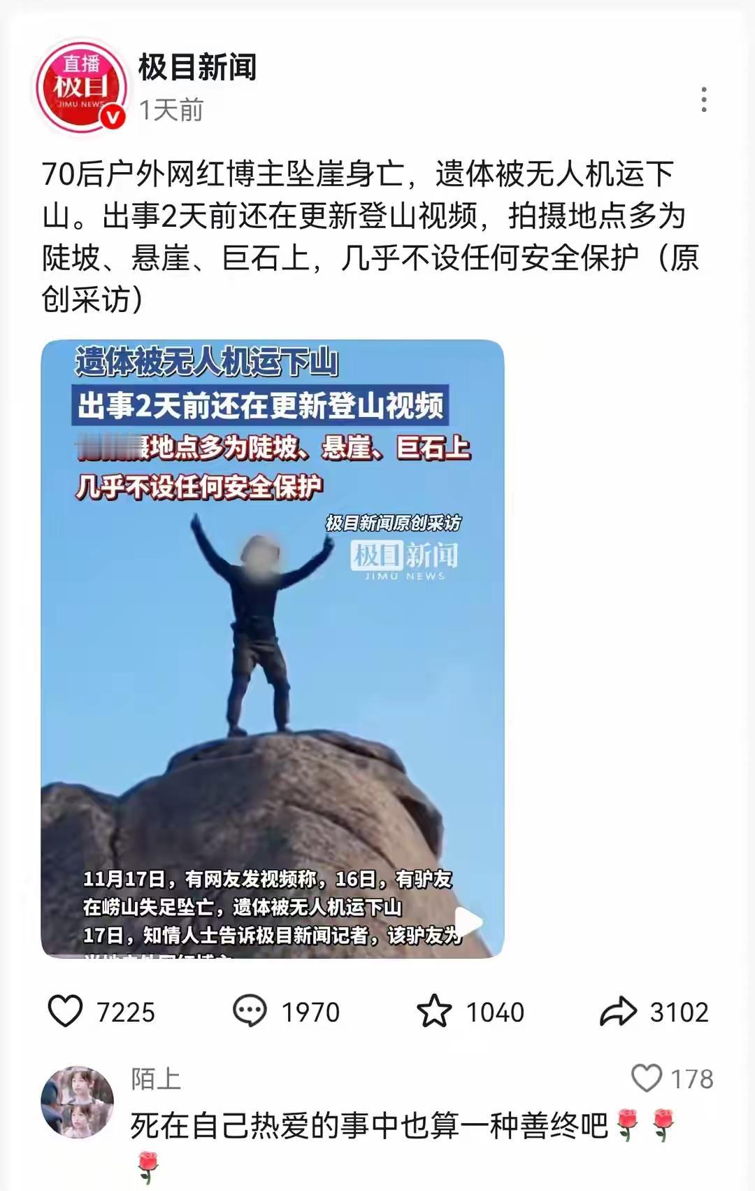 “劝了白劝!”崂山鲫鱼背,70后网红涛哥徒手示范横移,岩点脱落直坠百米,无人机吊运遗体下山;起因拒绝安全绳,经过高坠失联,结果确认身亡群解散;网友:早系一根绳,何至于此。 16日中午涛哥在大流顶示范无保护动作时失手坠落,因崖壁过陡队员无法靠近,最终调用载重200公斤无人机将遗体运送下山。 同行者回忆,他前一日连上12小时夜班,仍坚持带队,脚穿磨损旧鞋,未系安全绳,右手岩点松脱,人瞬间跌落视觉死角,常规担架无法抵达,只能改用吊运。 其账号随即隐藏所有作品,2000人登山群宣布解散,管理员公告“尊重逝者及家属隐私”,群内曾设“无绳攀爬”入群测试,提议用绳者被斥“怂包”。 网友翻出他此前回怼“胆小鬼才需要安全绳”的留言,直言悲剧本可避免,如今家人承担后果,户外圈再敲安全警钟:经验不敌岩点松动,敬畏才是保命绳。 对于这件事情,大家有什么看法?