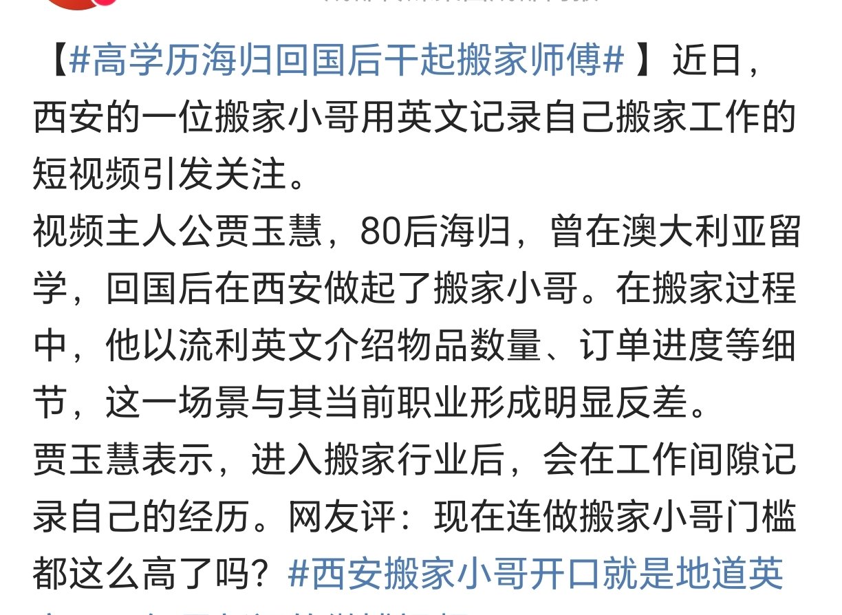 劳动致富,搬家工也没什么看不起的,而且他说英文还做自媒体,英文没有浪费
