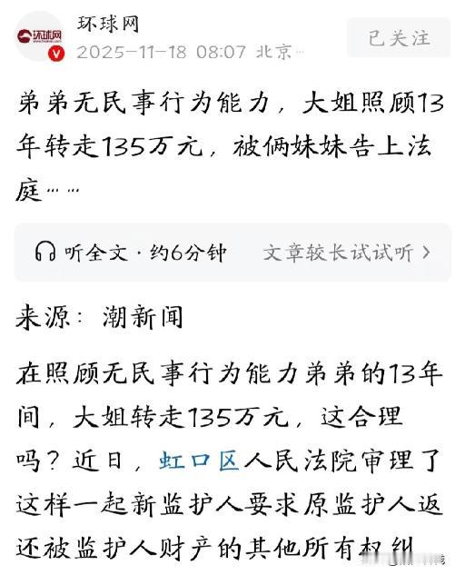 上海,男子患精神分裂,未婚未育,退休后被姐姐和两个妹妹送到了疗养院长期居住。他每月退休金五六千,还攒了上百万元,都交给姐姐代为保管。谁知13年后,妹妹竟然发现姐姐悄悄从哥哥卡上转走了135万余元,但只有很少一部分花在了哥哥身上,其他的全进了姐姐腰包。于是,两妹妹将姐姐告上法庭,要求立刻还钱。法院经过调查,却发现了更加震惊的真相。   上海市虹口区人民法院的审判庭内,70万元的返还判决敲定的那一刻,原告席上的两位妹妹指尖微微发颤,被告席的大姐则始终垂着脑袋。   这场横跨13年的手足纠葛,终究以法律划下底线,可那份被金钱啃噬的亲情,却再也回不到最初的模样。   故事的核心,是被监护人刘先生半生的孤苦与无奈,年过六旬的刘先生,自青年时确诊精神分裂症后,人生便少了寻常人的烟火气。   他终身未娶,无儿无女,父母早逝后,三位姐姐成了他唯一的亲人。   2010年退休前夕,考虑到刘先生的病情需要专业照护,三姐妹坐在一起商量,最终决定将他送入辖区内的精神卫生中心长期托养。   那时姐妹仨握手约定,要一起把弟弟照顾好,谁也没料到,这个温暖的承诺会在岁月里变味。    更没人能想到,这位常年住院的病人,竟是个“隐形的小康之家”。   刘先生退休后每月有5000多元退休金,加上每月600元的交通补助、300元的残疾人专项补贴,再算上每季度300元的敬老卡福利,月均收入近6000元。   更关键的是,他病前是出了名的“铁公鸡”,工资除了基本开销全存起来,日积月累攒下了百万积蓄。   更省心的是,原单位有明确政策,精神卫生中心的护理费能报销大半,日常吃喝用药几乎不用额外掏钱。    大姐是老大,做事稳当,钱交她管我们放心,基于这样的信任,三姐妹约定,刘先生的三张存折、身份证、医保卡等全部交给大姐保管,日常开销由大姐记账支出。   此后13年里,两位妹妹从没过问过账目,在她们看来,亲姐姐总不会亏待亲弟弟,这份毫无设防的信任,反倒给了私心滋生的空间。    2023年的一场遗产之争,成了引爆矛盾的导火索,因为父母留下的老房子拆迁款分配不均,三姐妹从拌嘴升级到对簿公堂,昔日的温情彻底消散。   争吵中,有人无意间提起“弟弟的钱一直是大姐管着”,这句话点醒了两位妹妹。   她们随即向法院申请:宣告刘先生为无民事行为能力人,并更换监护人。    法院的初步调查就让人心头一沉:大姐的银行流水显示,她多年来频繁从刘先生账户取现,部分款项直接转入自己和女儿的账户,存在明显的财产混同。   最终,法院依法宣告刘先生无民事行为能力,并指定两位妹妹为新监护人。    交接账户时,两位妹妹翻看着银行流水,越看越心惊:13年间,大姐从弟弟账户累计取现、转账高达135万元!   他天天在医院,吃穿用都有保障,这钱到底花在哪了?带着这个疑问,姐妹俩以刘先生法定代理人的身份,将大姐告上法庭。    庭审时,大姐抹着眼泪辩解,自己13年里“掏心掏肺照顾弟弟”,我每月都接他出来住,租房、看病、买营养品,哪样不要钱?房租年年涨,花销根本降不下来!   可当法官让她出示大额支出凭证时,大姐却支支吾吾拿不出来,而 两位妹妹当庭拿出的证据,更戳穿了这份“委屈”。   她们查访发现,大姐口中“给弟弟租的周转房”,其实一直是大姐和女儿一家住着,屋里的装修风格还是外甥女喜欢的北欧风,但这笔十多万元的装修费,赫然出自刘先生的账户。   更让人气愤的是,有三年刘先生因病情加重,医生明确要求“不可离院”,可大姐一家照样住着那套房子,每月3000多元的租金全从弟弟账户扣除。    更离谱的是,刘先生名下还有一套小平米住房,本是父母留下供他偶尔出院暂住的,却被大姐悄悄挂在中介转租,近十年的租金全进了自己腰包。   我们去精神卫生中心调了出入记录,13年里弟弟总共就出来66次,平均每年才5次,每次都是看病或过年聚餐,最多住一两天,哪需要常年租着房子?   妹妹的质问,让大姐哑口无言,法官当庭算了笔明白账:刘先生每月近6000元收入,加上单位报销的护理费,日常开销完全覆盖。   即便算上每年6到8次的外出就医、节日聚餐,13年的合理支出撑死不过20万元,与135万元的差额悬殊太大。    我国《民法典》第三十五条早已明确:监护人履职必须“最有利于被监护人”,除了维护其利益,绝不能动用其财产,这不是空洞的条文,而是切实的保障。   虹口区法院审理后认为,大姐的诸多支出远超“为弟弟利益”的范畴,已构成财产侵权。   但考虑到她确实有过接弟弟出院、购置生活用品等履职行为,最终酌情判决返还70万元。   刘先生的遭遇警示每个家庭:监护从来不是“单个人的信任游戏”,而是需要规则约束的责任。   唯有守住这份底线,才能让监护权回归初心,让亲情不再被金钱腐蚀。