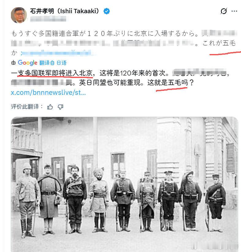 日本记者石井孝明面对现在的局势,掏出八国联军的照片。还说,要重建英日同盟。问题是,这些他觉得可以吓唬中国人的军队,现在还很强吗?