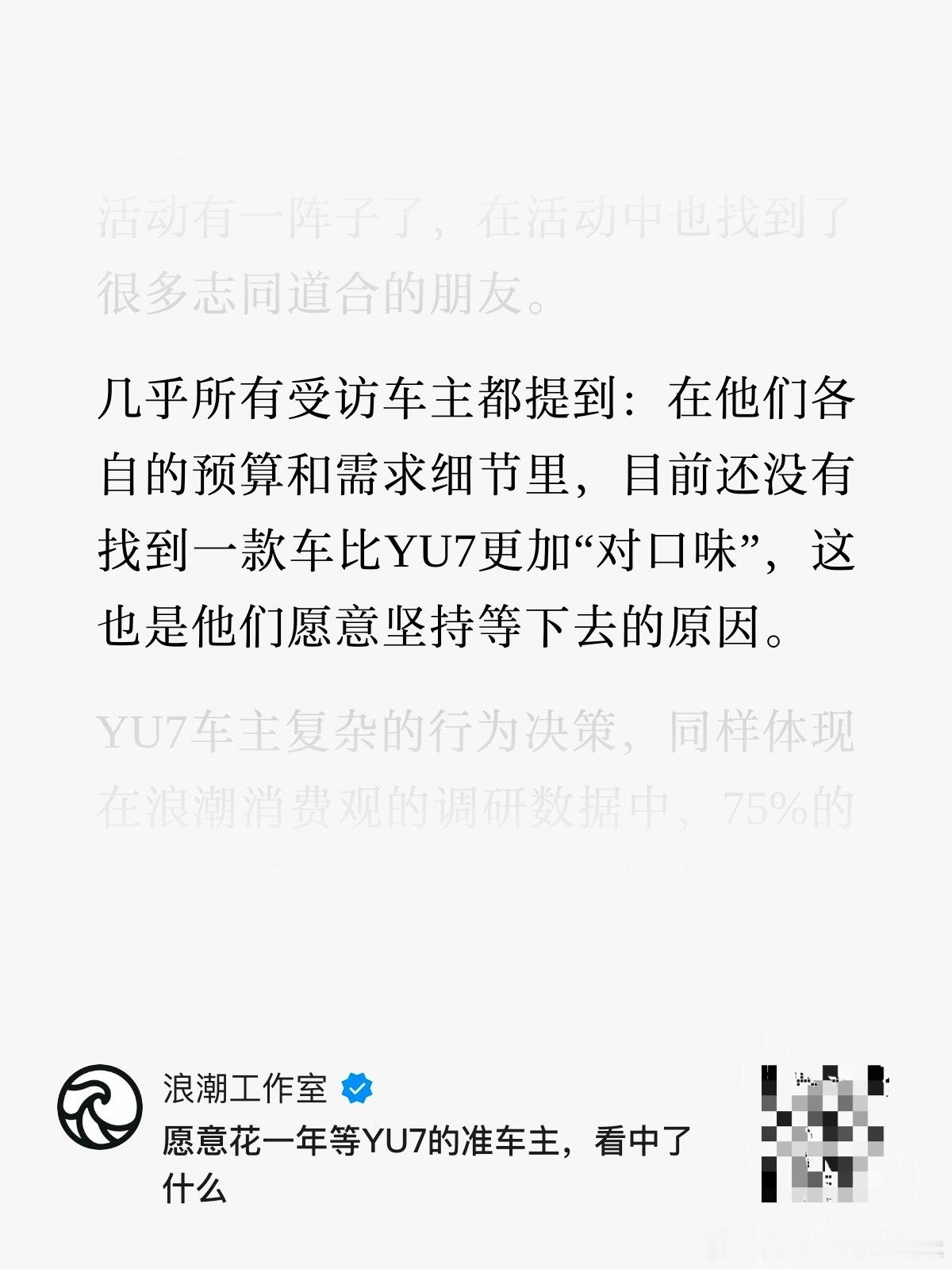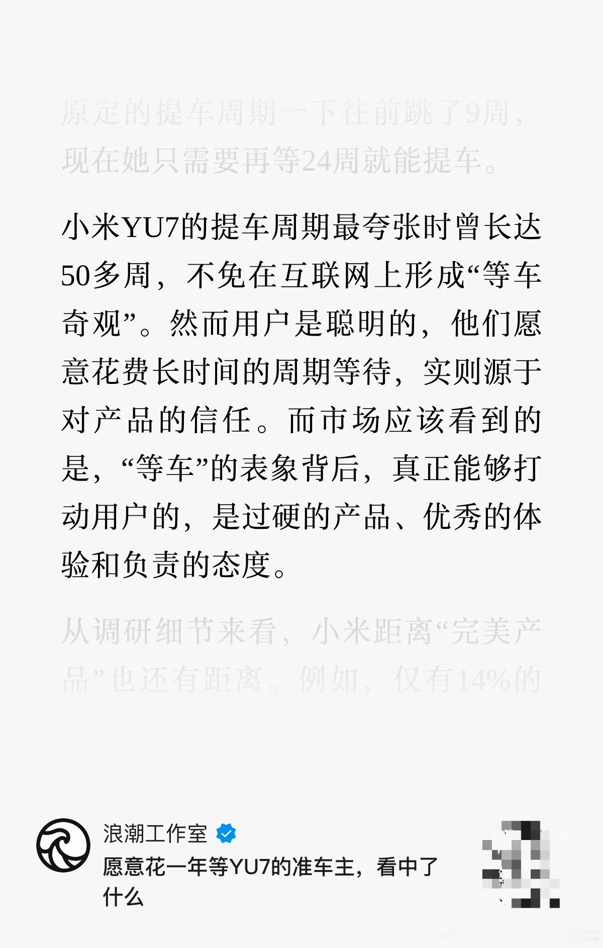 作为车主,我选择小米YU7其实就两句话,外观一见钟情看对眼了有想要深入了解的欲望,同时过硬的综合产品力超出我的预期让我下单定车。现在回过头来看,外观帅气是吸引我去了解这款车的一个前提因素,确实比市面上同档车型姿态和线条更好看耐看,没人不想要一台不平庸的好车。而YU7的内在的好操控、静谧性、长续航,双零重力座椅、天际屏、整车安全性以及科技感的座舱和智能车机以及互联生态是让我想要长期拥有这款车的核心理由也是我认为小米YU7另一个核心竞争力。这样足够惊艳打动人的车型,对于车主来说在市面上很难找到相似平替也是对生活品质的不将就的一种态度,这份独特性确实得到了不少人的认可,加上兜底购置税保障加持,坚持等车其实也是宁缺毋滥的一种表达。